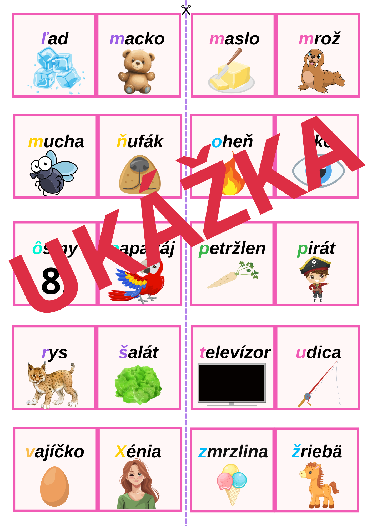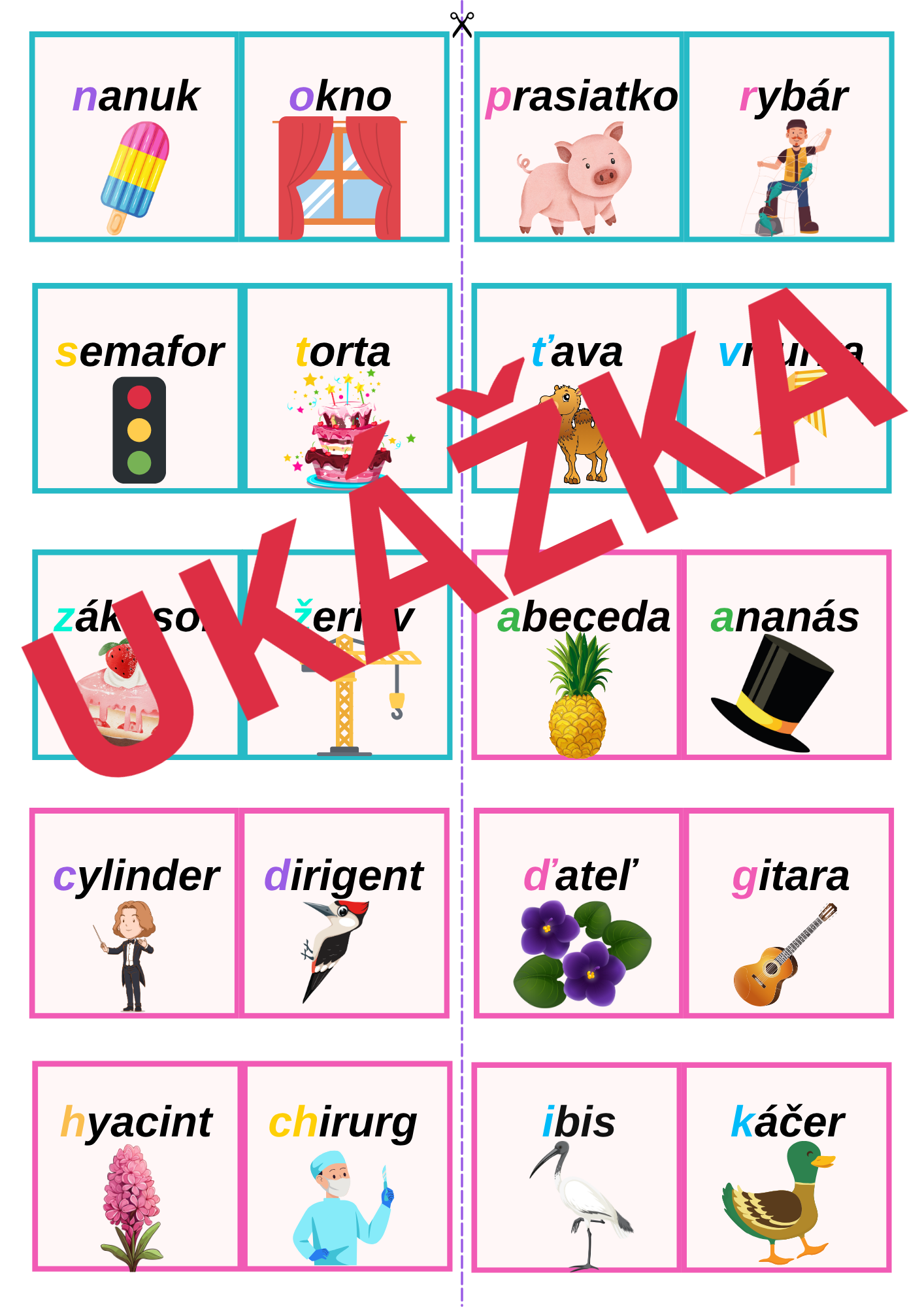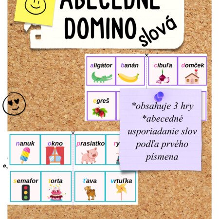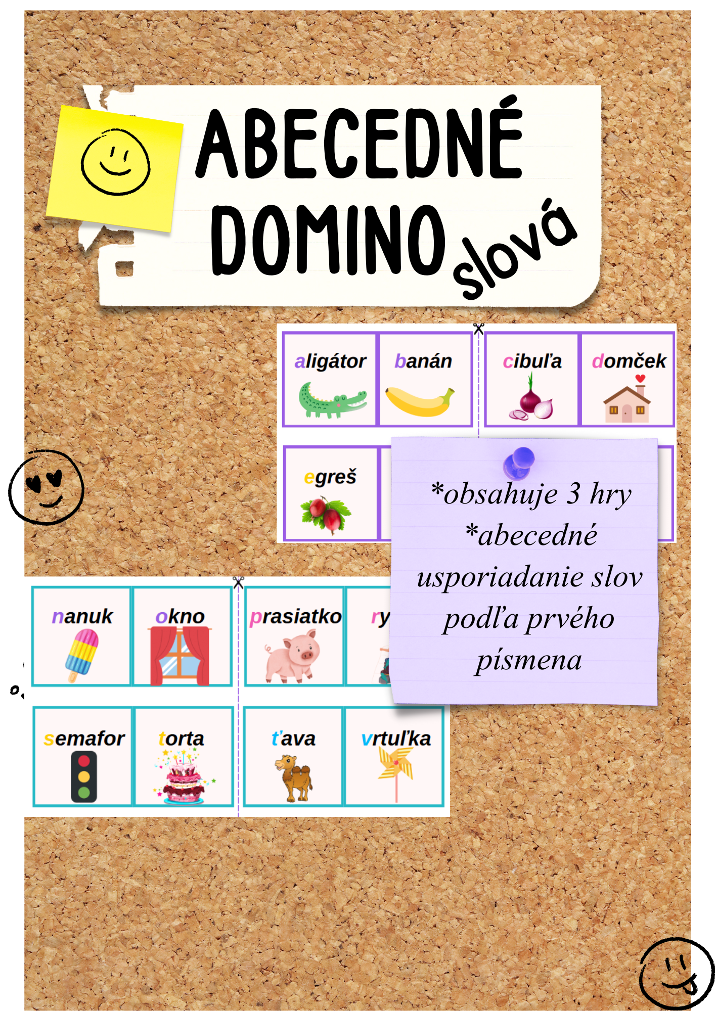 Úlohou žiakov je usporiadať slová podľa abecedy, pričom rozhoduje len prvé písmeno v slove. Pre väčšiu atraktivitu je každé slovo doplnené obrázkom. Prvé písmeno v slove je zvýraznené farebne.