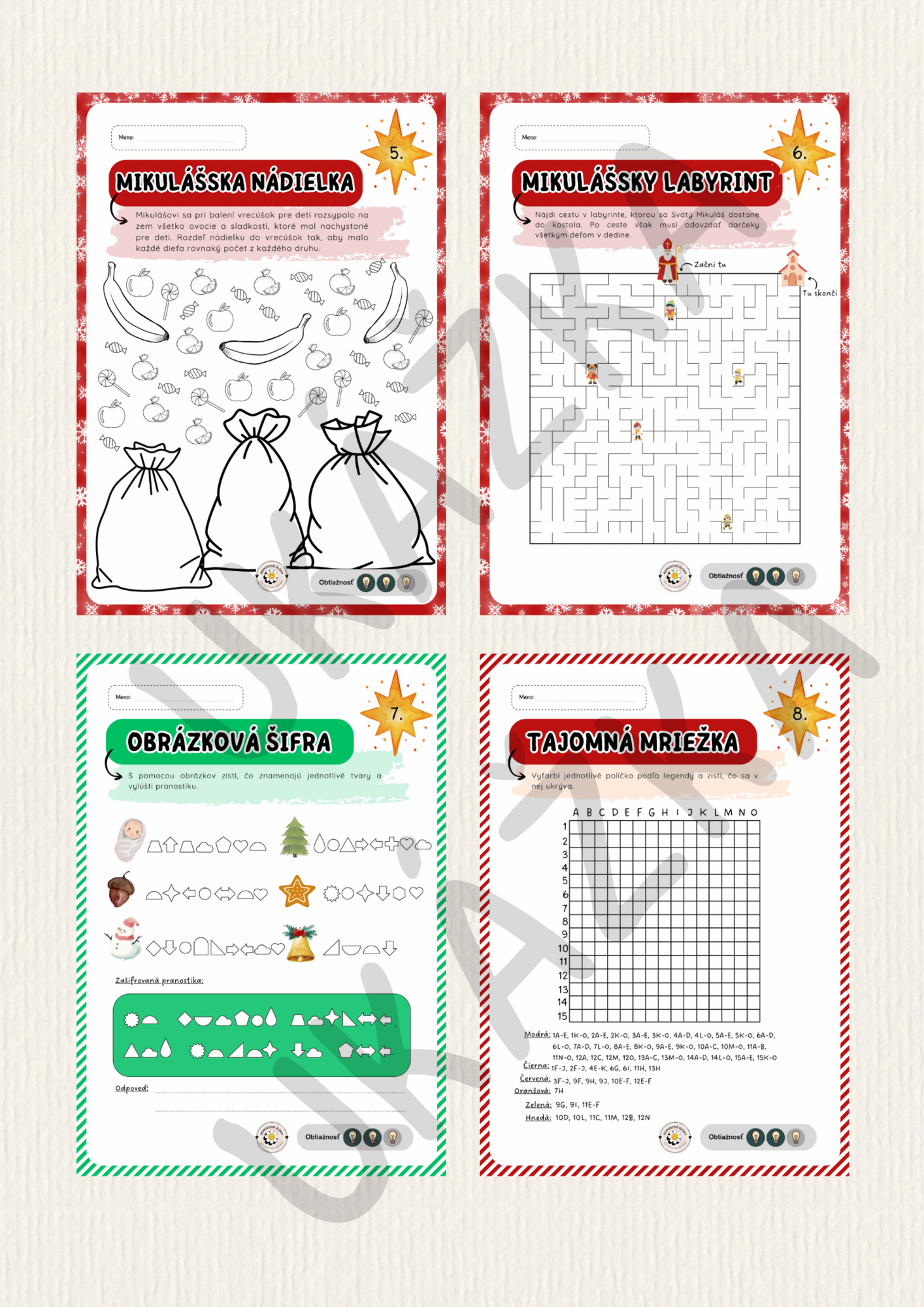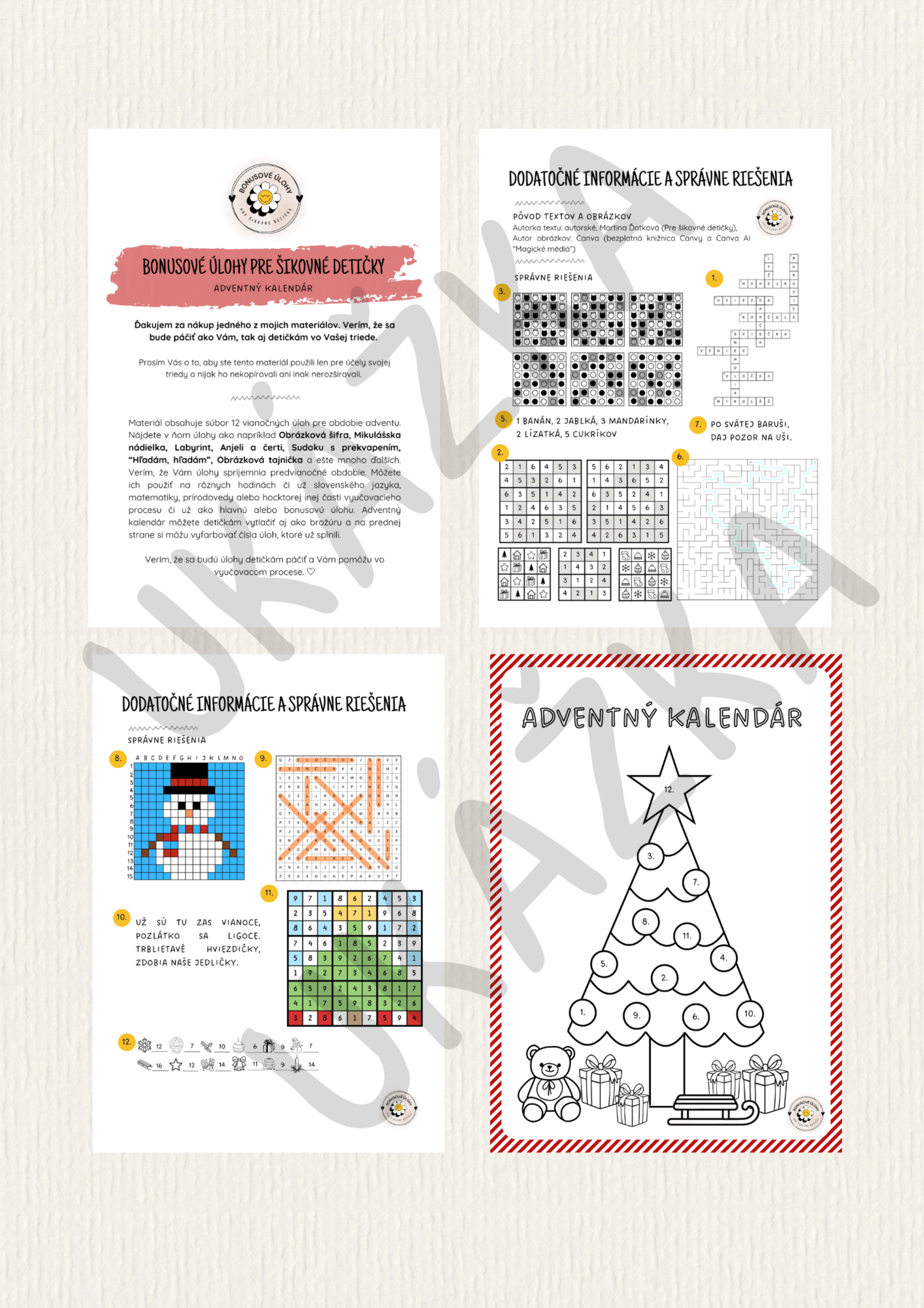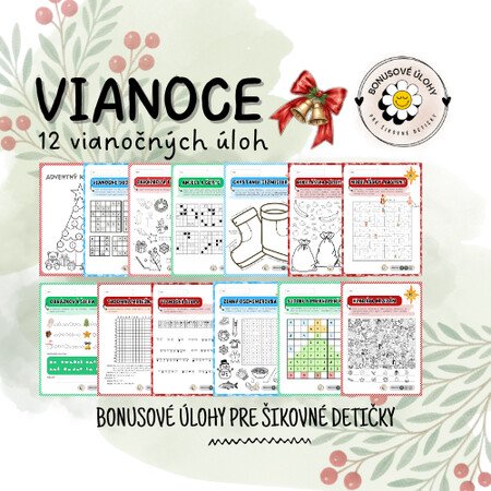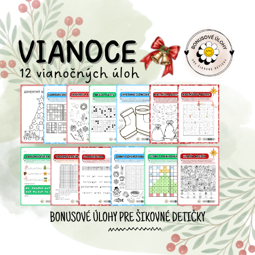 Adventný kalendár obsahuje 🎄 12 rôznych vianočných úloh ❄️ (vrátane 3 Mikulášskych), ktoré si deti môžu vypĺňať či už sami, vlastným tempom a cibriť si tak pri nich samostatnosť a logické myslenie, alebo ich môžu dostať vrámci vyučovacieho procesu.