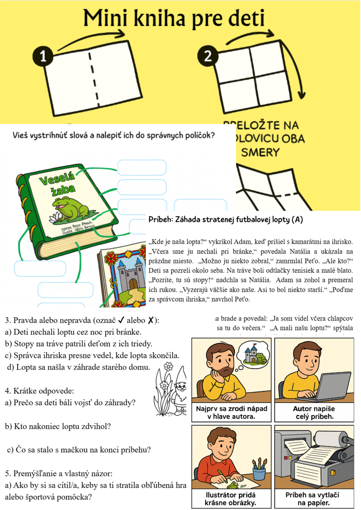 Materiál možno využiť pri preberaní priamej reči alebo počas marca mesiaca KNÍH. Žiaci si môžu vytvoriť svoju mini knihu podľa postupu (stránka so žltým pozadím). Na nasledujúcej stránke je takáto mini kniha venovaná skúmaniu kníh reálnych. Žiaci si v školskej alebo triednej knižnici vyberú knihu a zisťujú si o nej rôzne informácie: názov, meno autora a ilustrátora, rok vydania a počet strán, zisťujú si má obsah a register pričom žiakom vysvetlíme rozdiel medzi nimi.