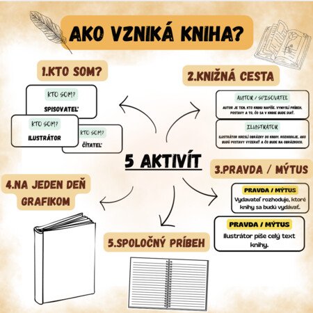 - Knižná cesta - 12x kartičky s pojmami z aktivity “Kto som?” s vysvetleniami daných rolí, pripravené na zoraďovanie celého procesu vzniku knihy.