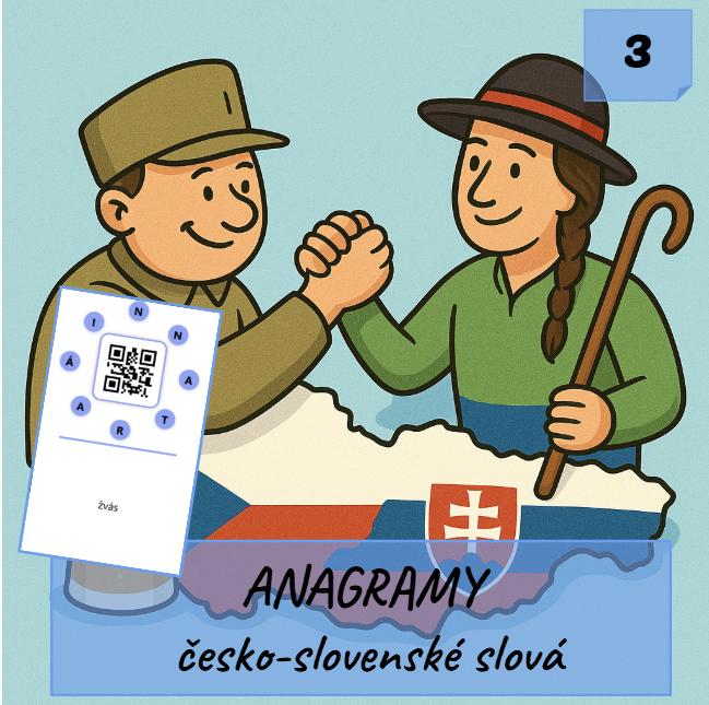 Viete, čo znamená cepín v češtine alebo ako sa po česky povie ríbezľa? Vyskúšajte hru Anagramy – česko-slovenské slová (3. diel) a zistite, ako dobre rozumiete jazyku našich susedov. Úlohou hráčov je rozlúštiť anagram a určiť, čo slovo znamená v češtine alebo slovenčine. Hra rozvíja slovnú zásobu a pravopis, čitateľskú gramotnosť, porozumenie medzi češtinou a slovenčinou, tímovú spoluprácu a komunikačné zručnosti.