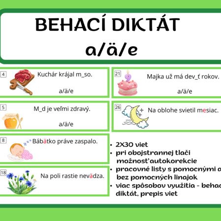 Materiál obsahuje 2 X 30 kartičiek - viet. Vo vetách sa nachádzajú slová s a/ä/e (najmä s ä)