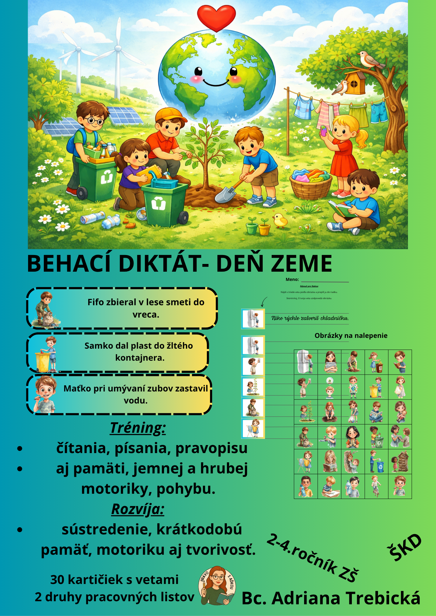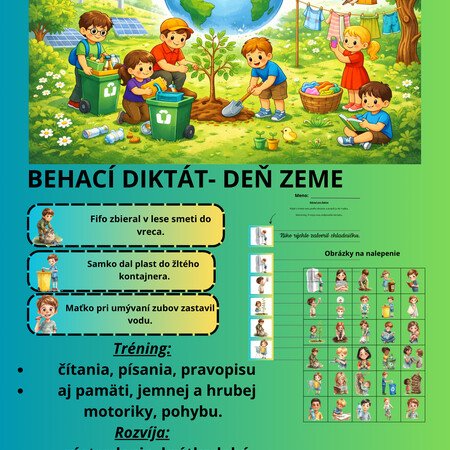 Interaktívny a hravý behací diktát pre druhákov, ktorý spája čítanie, písanie, strihanie, lepenie a pohyb v tematike Dňa Zeme. Deti sa učia cez aktívne objavovanie a hru, pričom zažívajú radosť z pohybu – v triede, ŠKD, telocvični, na chodbe alebo dokonca vonku na školskom dvore.
