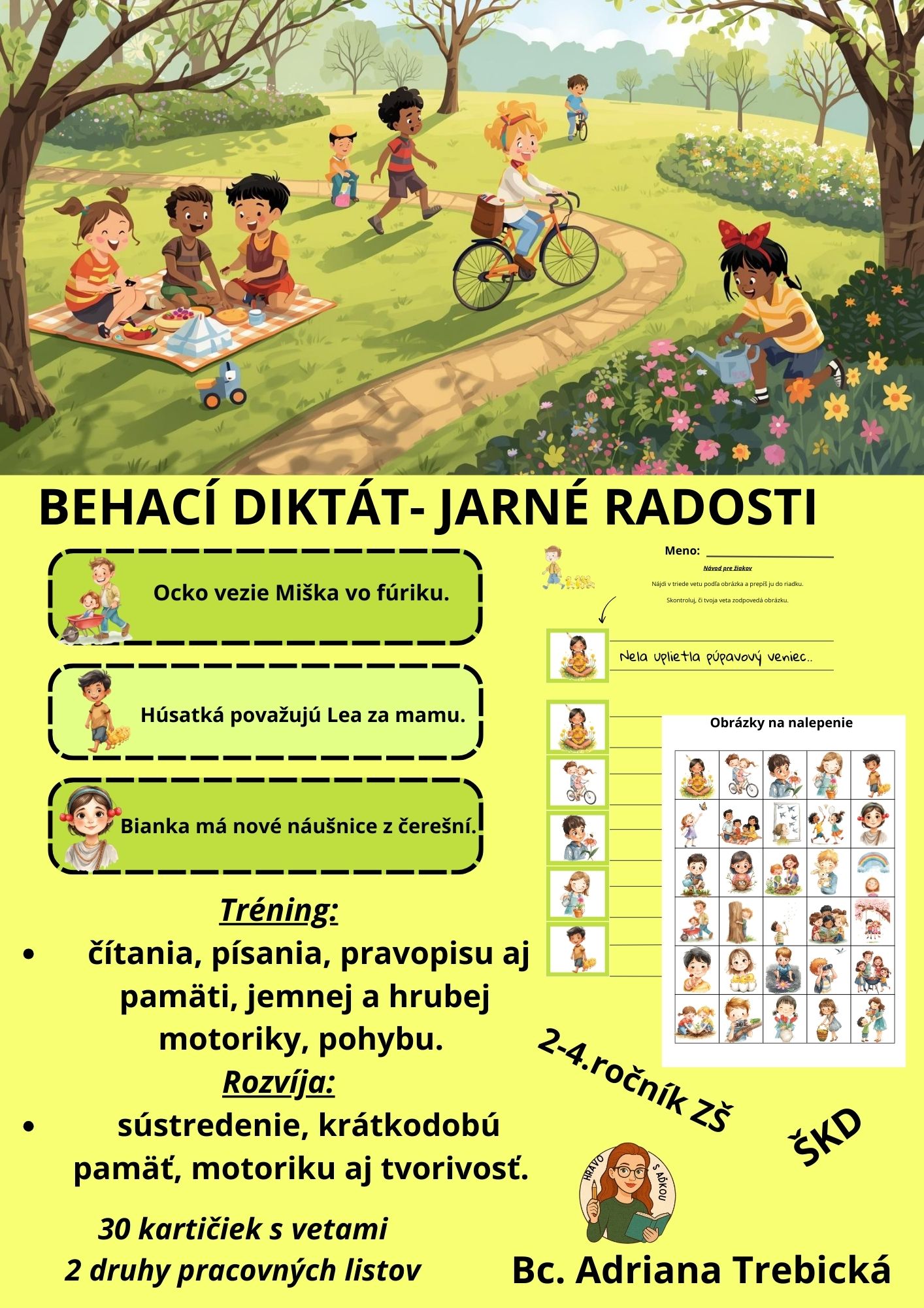 Interaktívny a hravý behací diktát pre druhákov, ktorý spája čítanie, písanie, strihanie, lepenie a pohyb v jarnej tematike. Deti sa učia cez aktívne objavovanie a hru, pričom zažívajú radosť z pohybu – v triede, ŠKD, telocvični, na chodbe alebo dokonca vonku na školskom dvore.