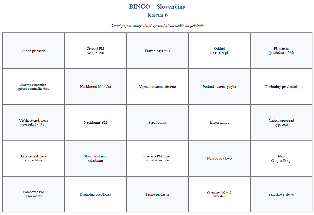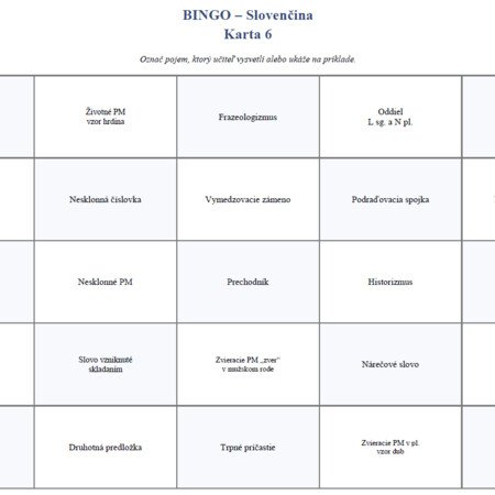 Materiál je určený na opakovanie a upevňovanie učiva zo slovenského jazyka a literatúry na 2. stupni základnej školy. Je spracovaný formou didaktickej hry BINGO – Slovenčina a obsahuje 12 rôznych hracích kariet, na ktorých sú rozmiestnené jazykové pojmy a gramatické javy. Každá karta je zostavená tak, aby žiaci pracovali s rovnakým okruhom učiva, no v odlišnom poradí, čo podporuje pozornosť a samostatné uvažovanie.
