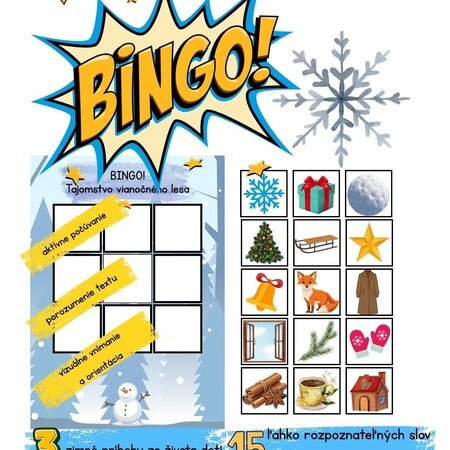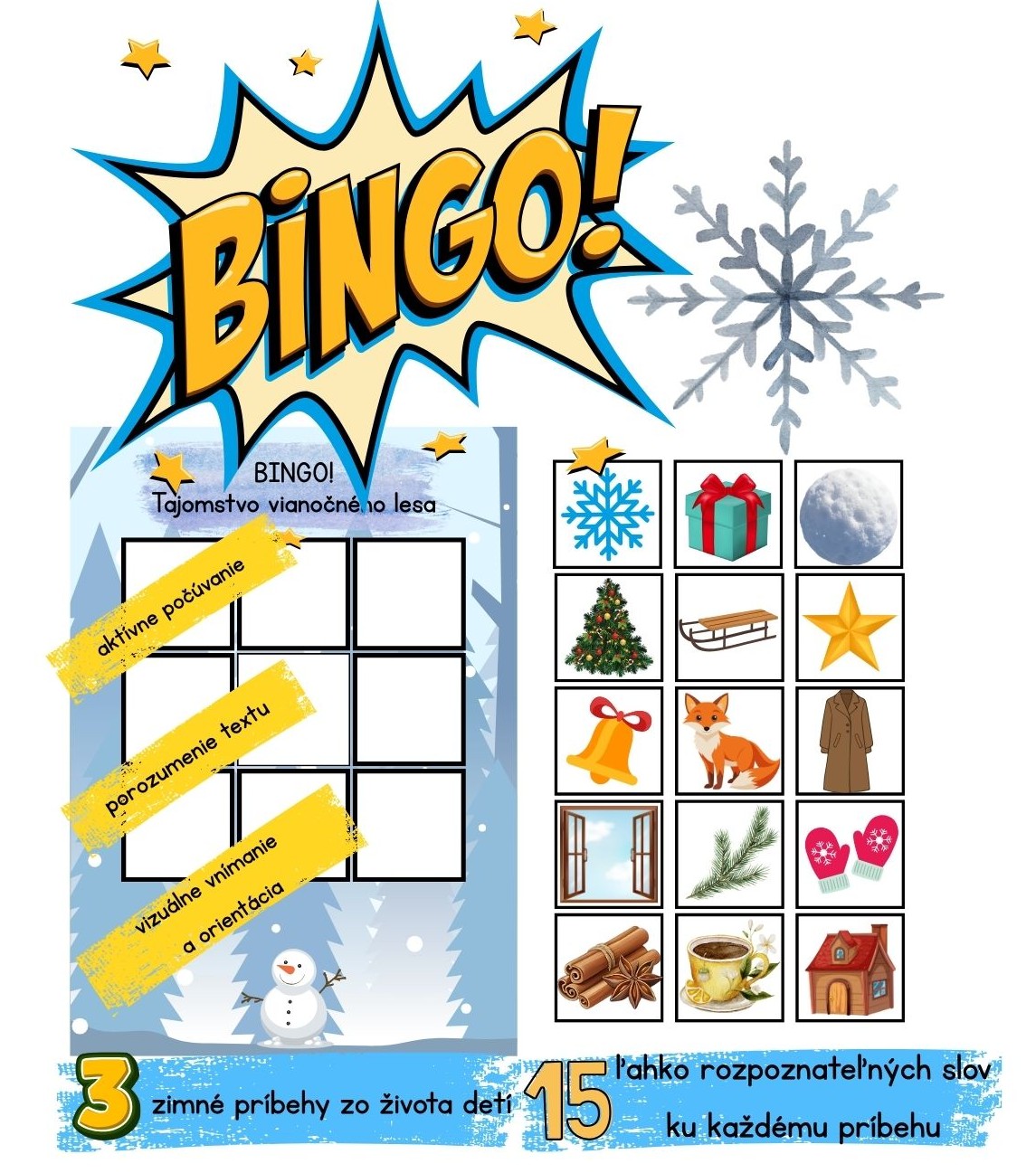 Materiál obsahuje 3 zimné príbehy zo života detí a 15 ľahko rozpoznateľných slov ku každému príbehu. Deti si z obrázkov vyberú 9 slov a nalepia si ich na svoju bingo kartu.