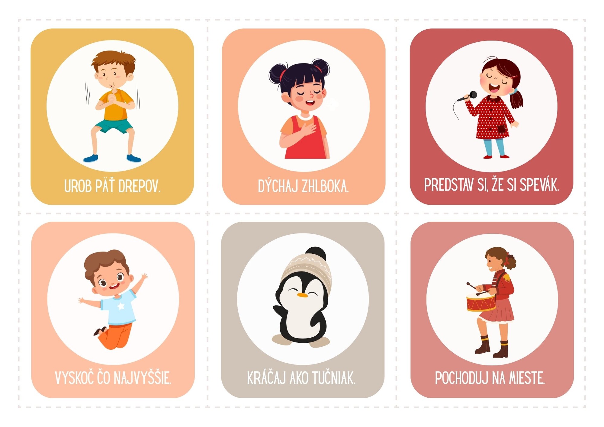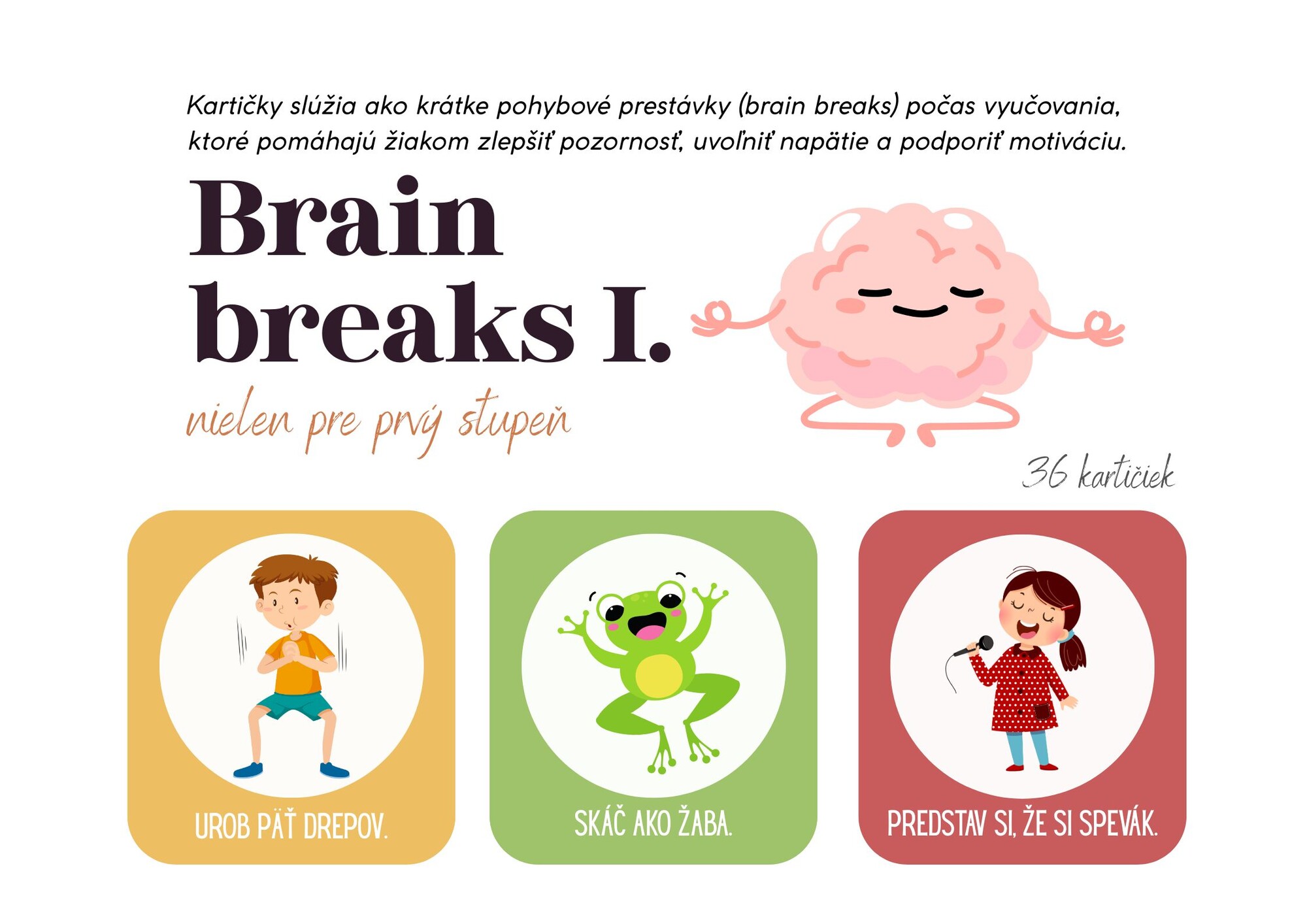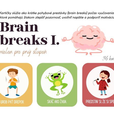 Materiál obsahuje 36 kartičiek brain breaks v Slovenskom jazyku. Kartičky slúžia ako krátke pohybové prestávky (brain breaks) počas vyučovania, ktoré pomáhajú žiakom zlepšiť pozornosť, uvoľniť napätie a podporiť motiváciu.