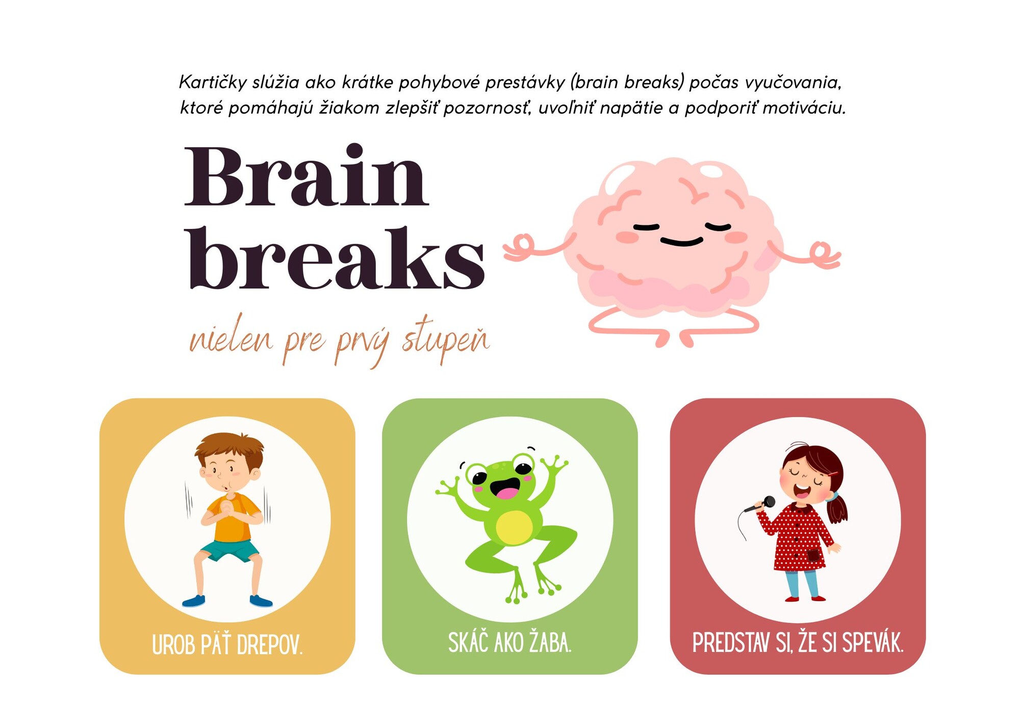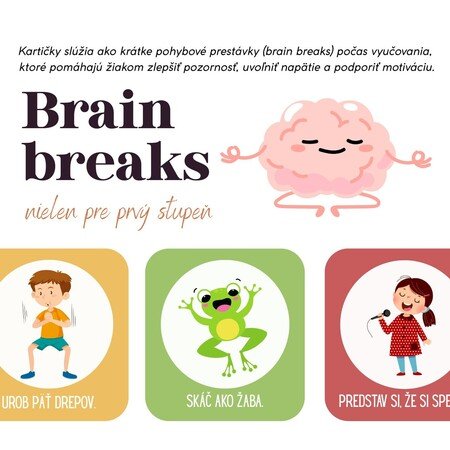 Materiál obsahuje 36 kartičiek brain breaks v Slovenskom jazyku. Kartičky slúžia ako krátke pohybové prestávky (brain breaks) počas vyučovania, ktoré pomáhajú žiakom zlepšiť pozornosť, uvoľniť napätie a podporiť motiváciu.
