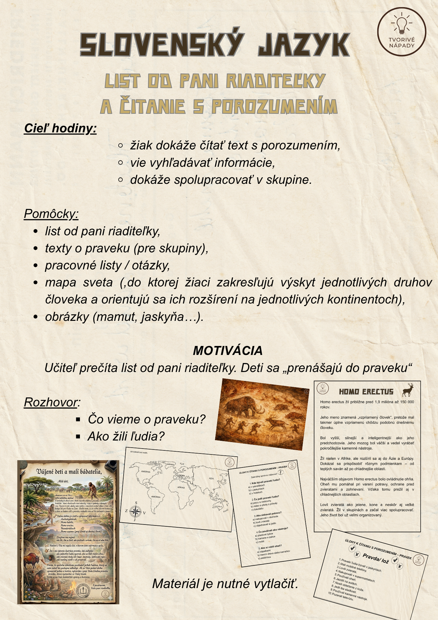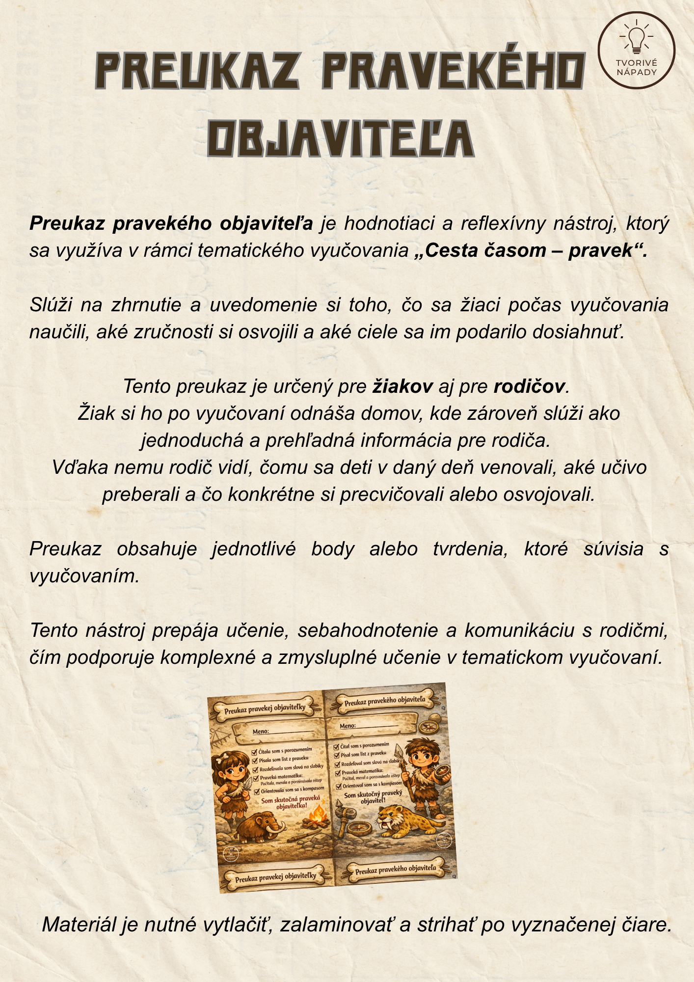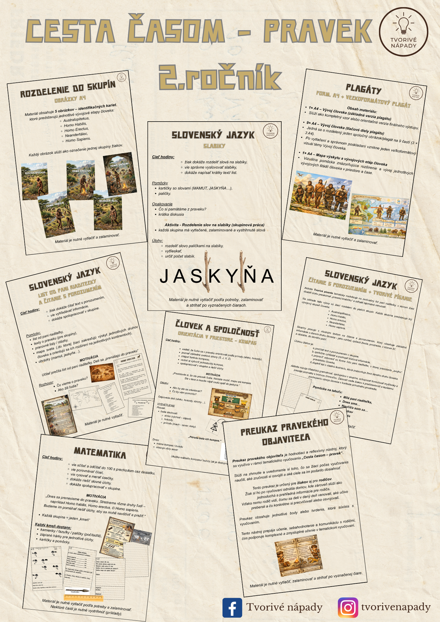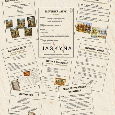 Tento súbor obsahuje materiál na 4 plnohodnotné vyučovacie hodiny, ktoré sú prepojené do tematického vyučovania s názvom Cesta časom – pravek. Aktivity sú navrhnuté tak, aby žiaci získavali poznatky zážitkovou, hravou a aktívnou formou, pričom sa rozvíjajú ich čitateľské, matematické, jazykové aj orientačné zručnosti.