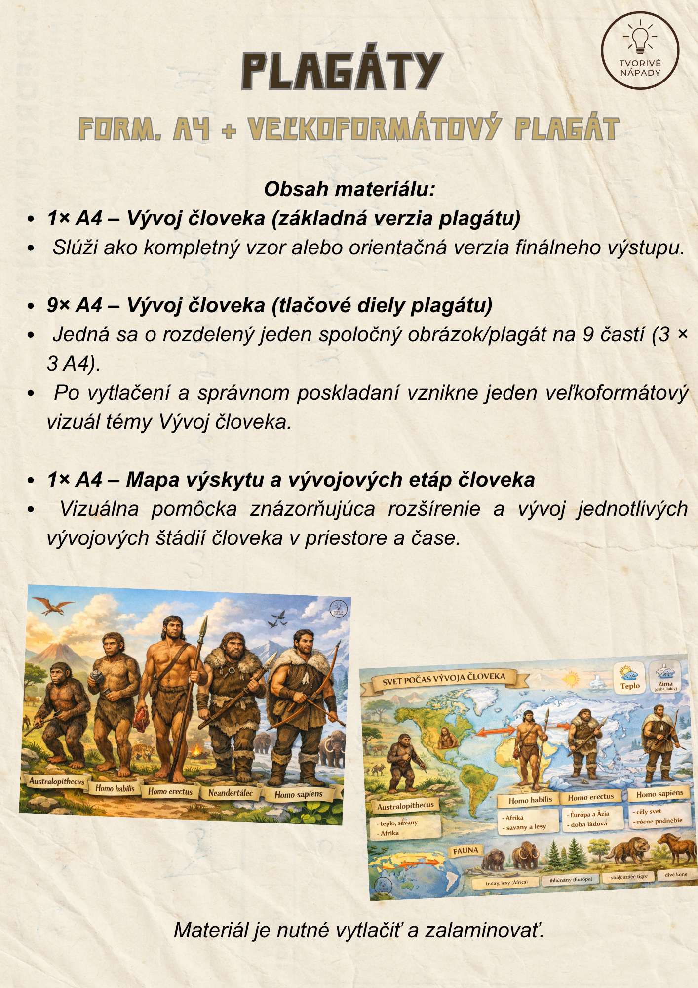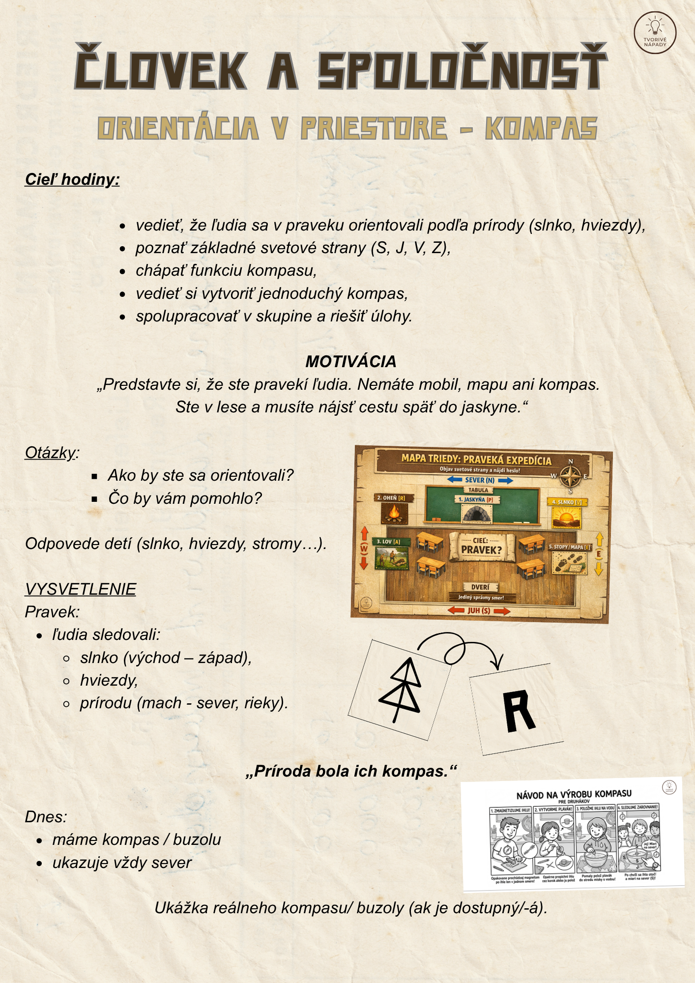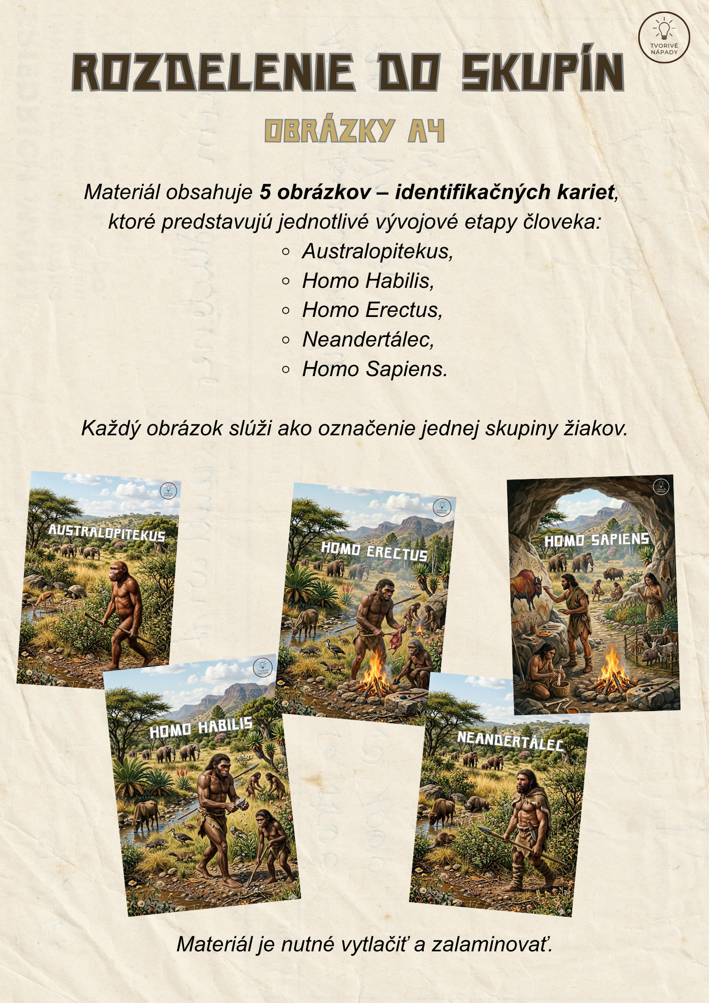 Tento súbor obsahuje materiál na 4 plnohodnotné vyučovacie hodiny, ktoré sú prepojené do tematického vyučovania s názvom Cesta časom – pravek. Aktivity sú navrhnuté tak, aby žiaci získavali poznatky zážitkovou, hravou a aktívnou formou, pričom sa rozvíjajú ich čitateľské, matematické, jazykové aj orientačné zručnosti.