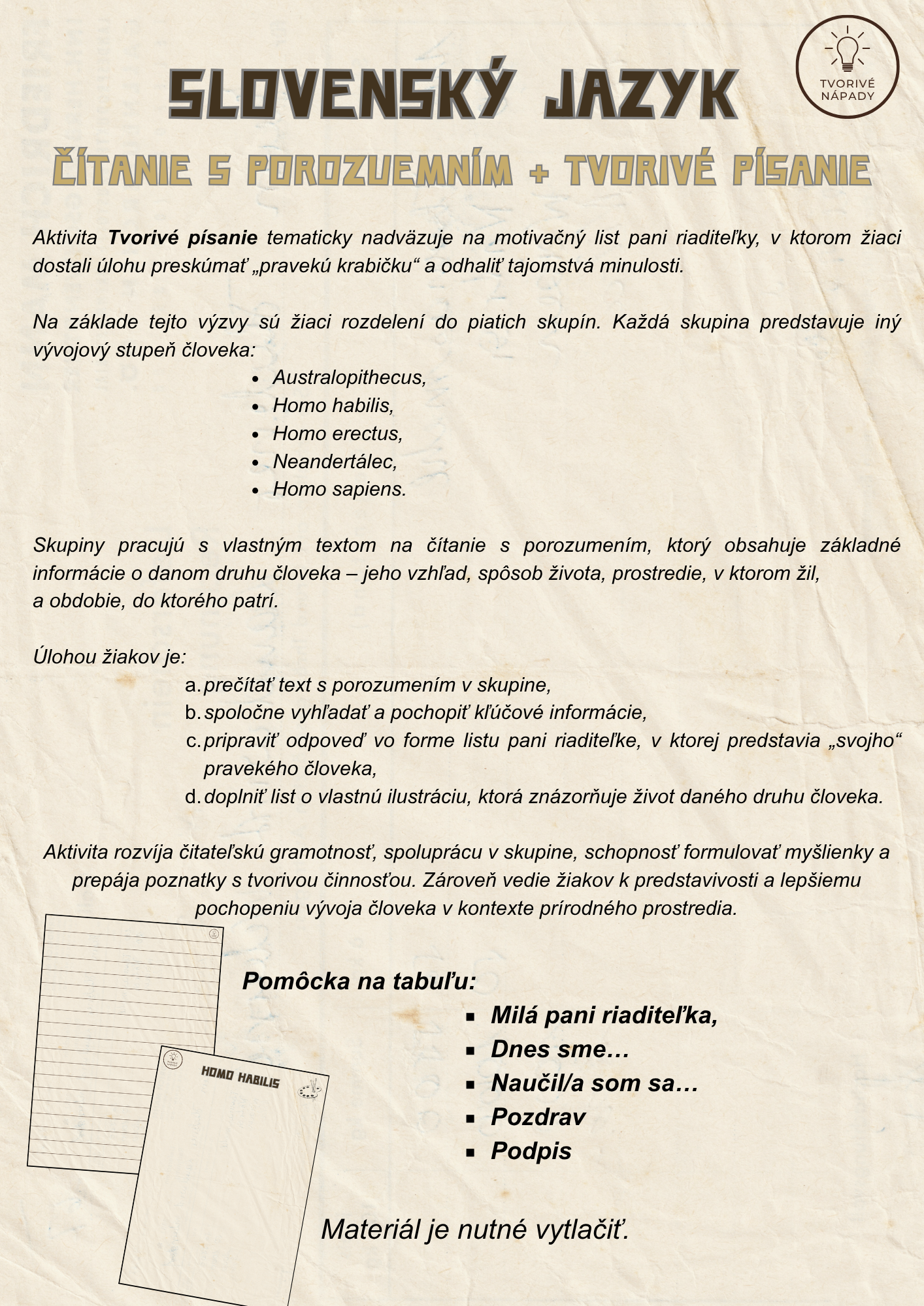 - tvorivé písanie – záznamový hárok (list pani riaditeľke)
