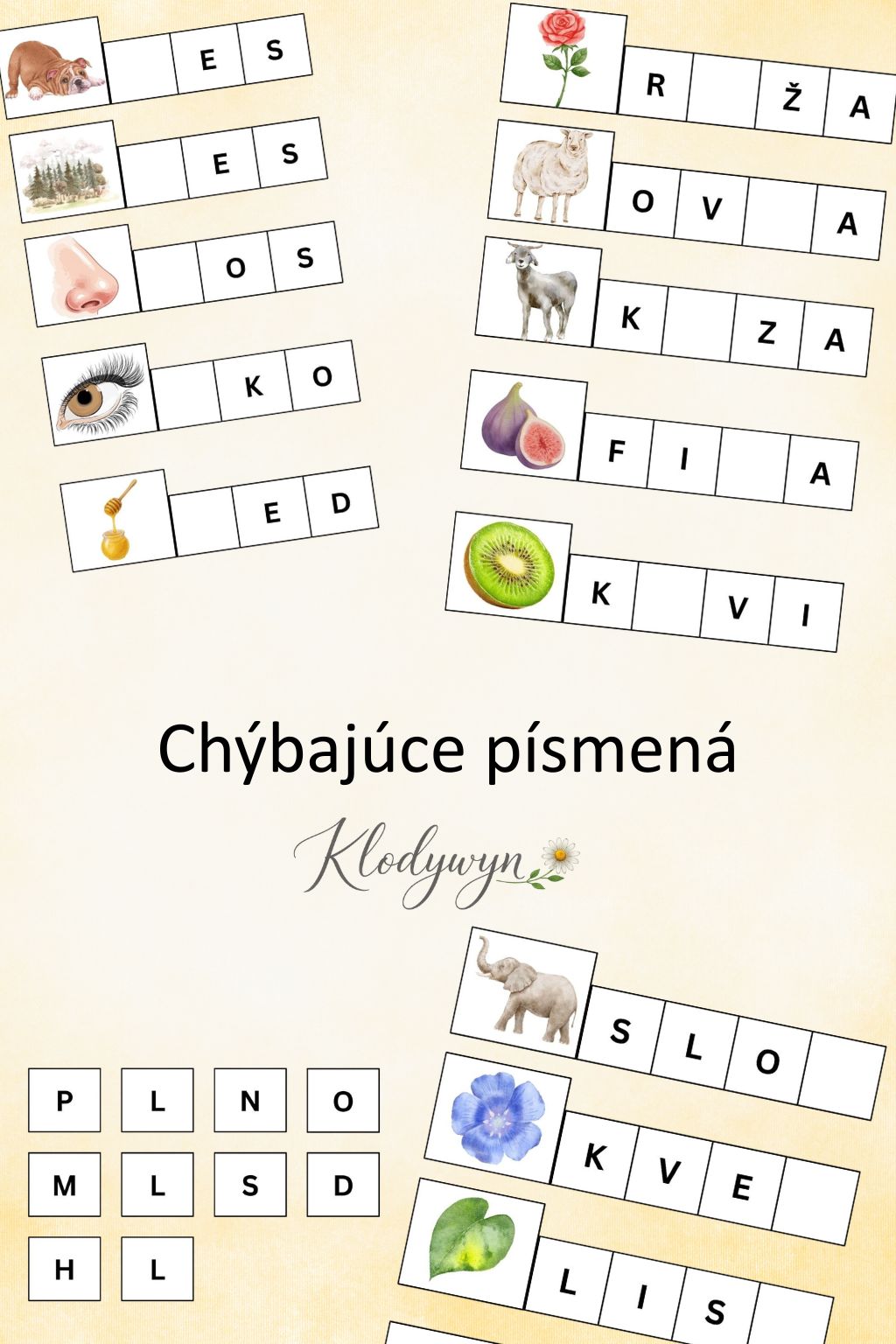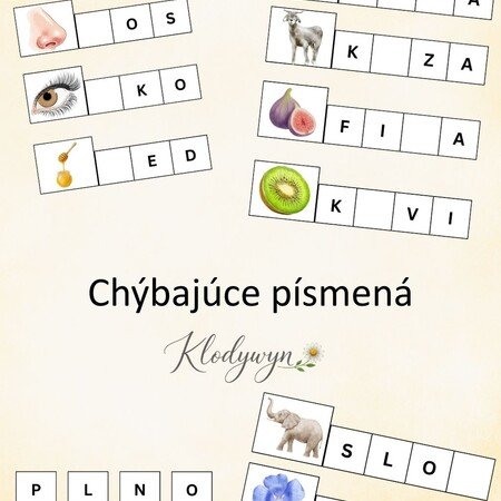 Tento vzdelávací balík aktivít obsahuje 11 strán a je určený pre deti v materskej škole a žiakov 1. ročníka. Zameriava sa na dopĺňanie chýbajúcich písmen v slovách, čím podporuje rozvoj jazykových schopností, fonematického uvedomovania a porozumenia slovnej zásobe.