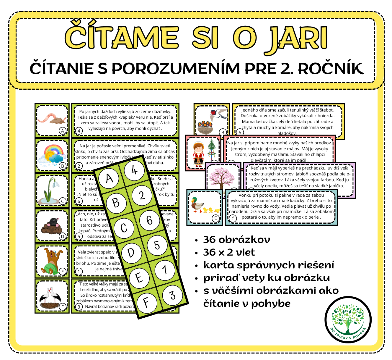 Materiál obsahuje 36 kartičiek s obrázkami v dvoch veľkostiach, 36 krátkych textov, karty so správnym riešením.