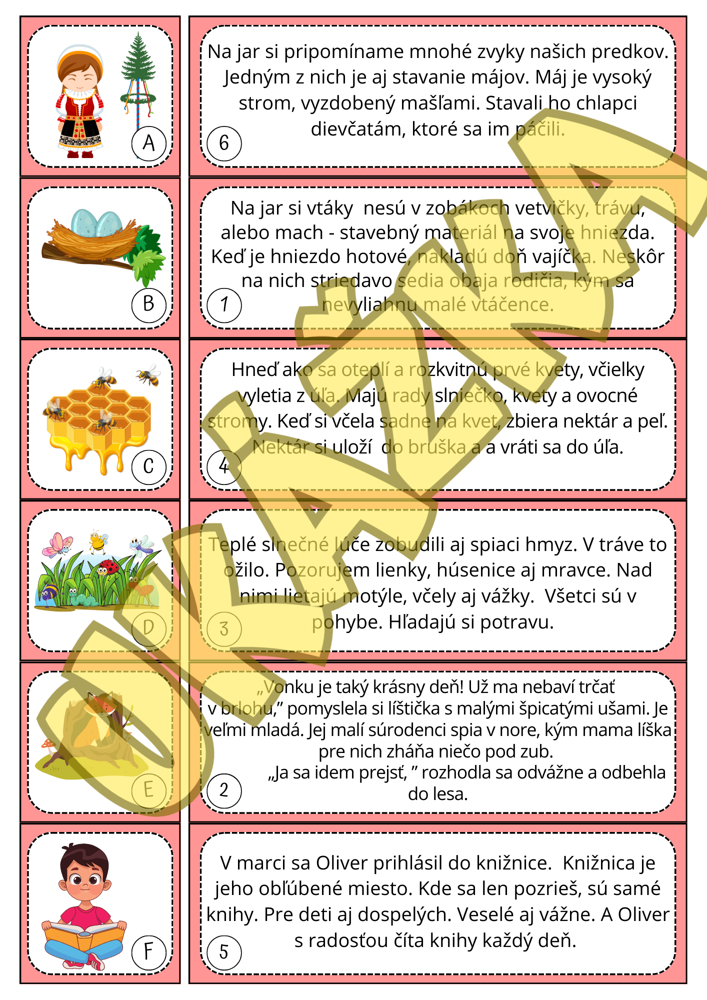 - Deti samostatne, alebo v dvojiciach čítajú texty a priraďujú k obrázkom. Po vypracovaní správnosť svojho riešenia overia pomocou karty riešení.