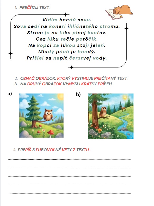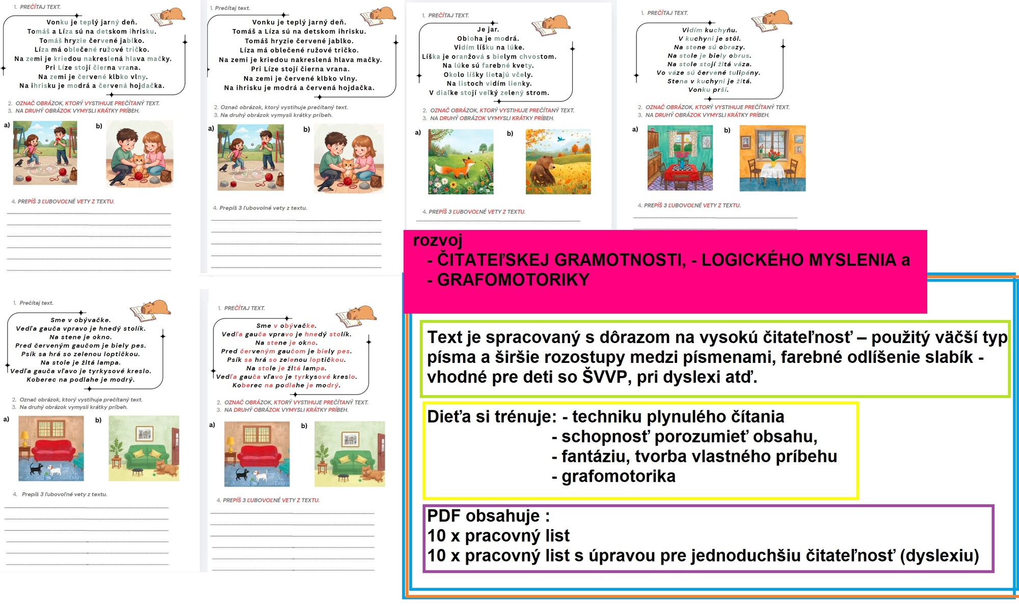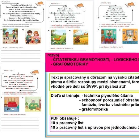 10 x pracovný list s úpravou pre jednoduchšiu čitateľnosť, s farebným odlíšením slabík (dyslexiu)