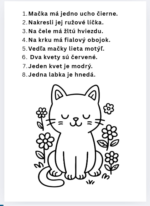 - Prevod textu na obraz: Ide o kľúčovú kognitívnu funkciu. Dieťa musí premeniť slová (abstraktný kód) v hlave na konkrétny vizuálny plán, čo má nakresliť.