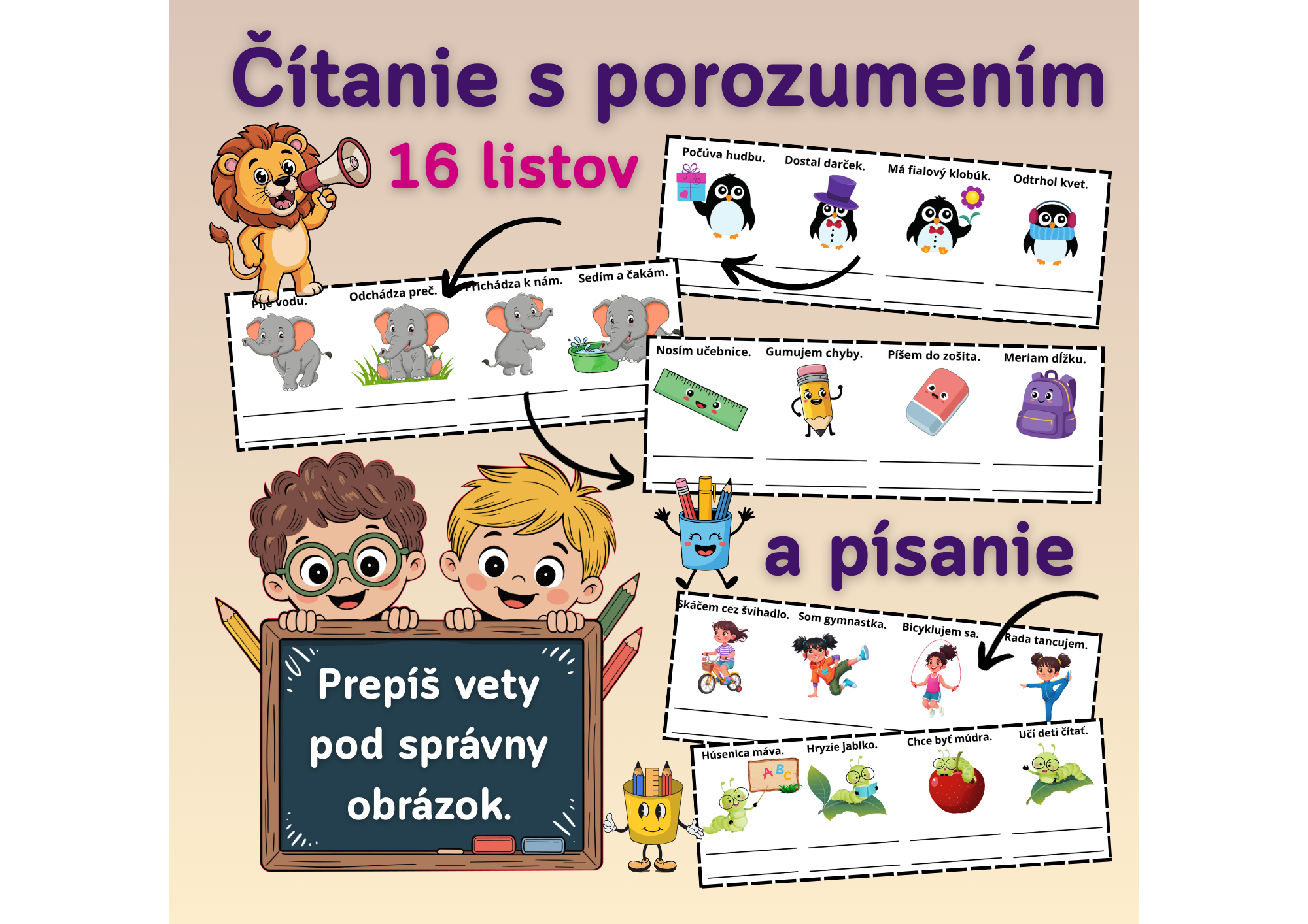 Na každom pracovnom liste sú 4 obrázky a 4 rôzne vety. Úlohou žiaka je: