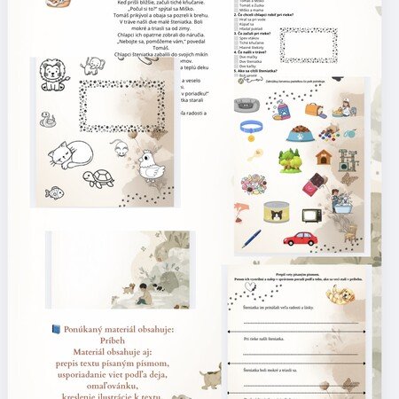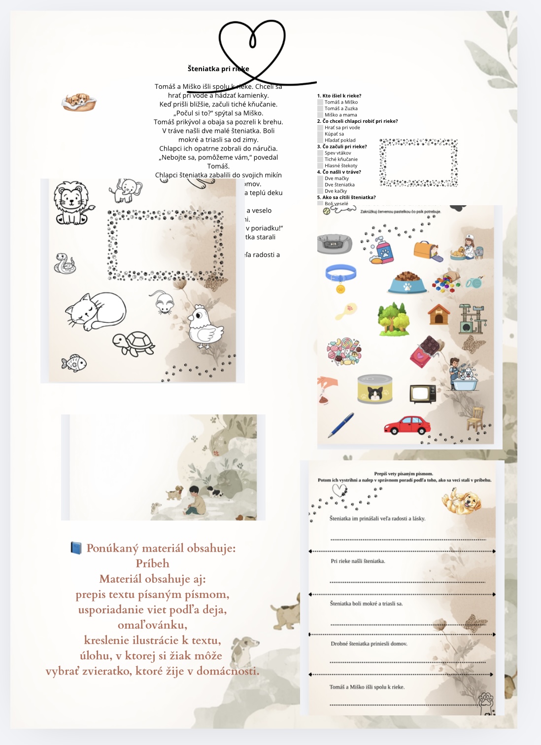 Materiál rozvíja čítanie s porozumením, prácu s textom, logické usporiadanie viet, písanie písaným písmom, kreativitu pri kreslení, rozhodovanie, a tiež podporuje zodpovednosť a empatiu pri starostlivosti o domáce zvieratá.