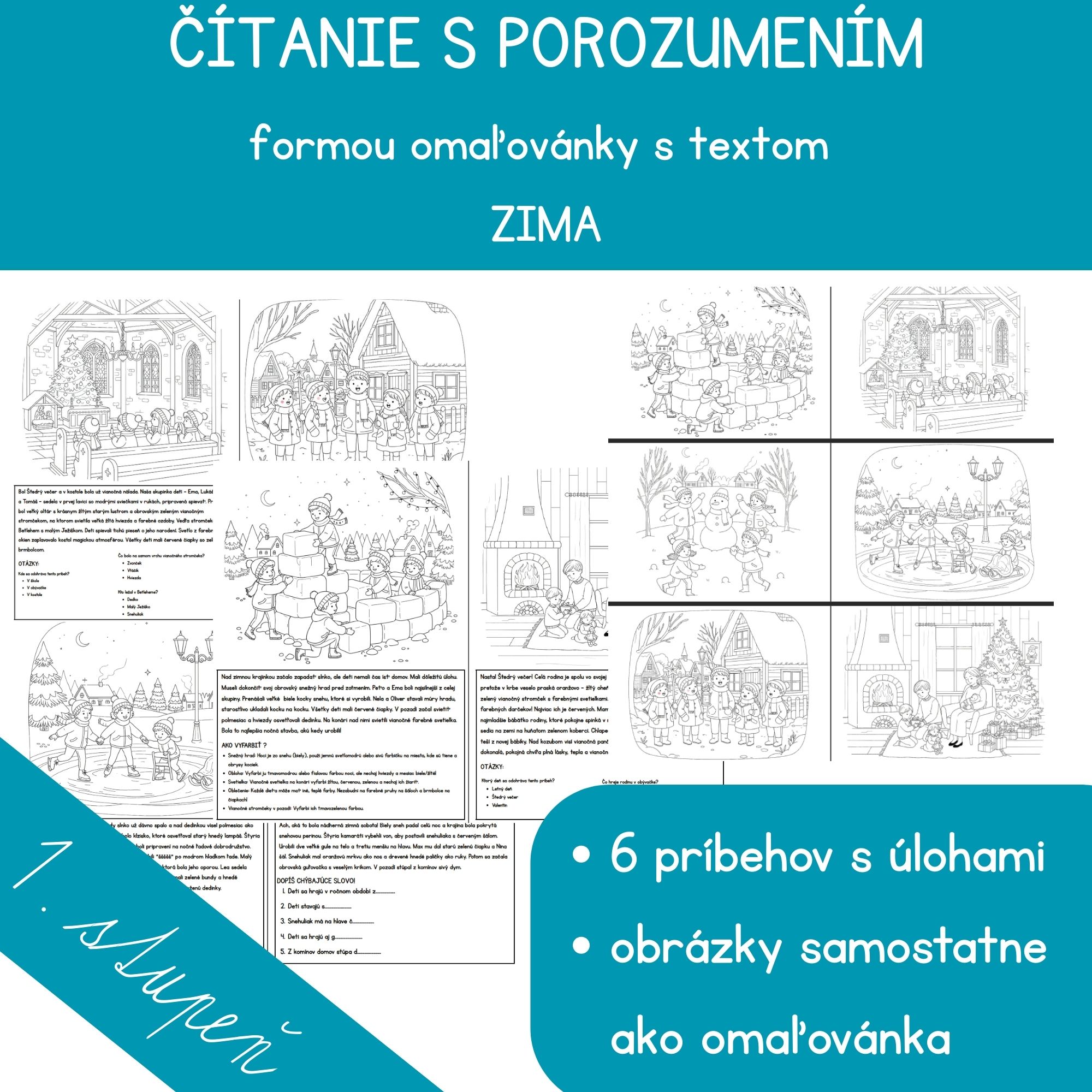 - 6 pracovných listov s omaľovánkou a textom s otázkami