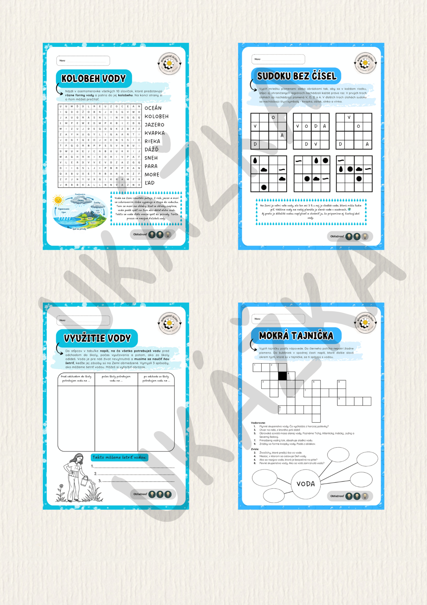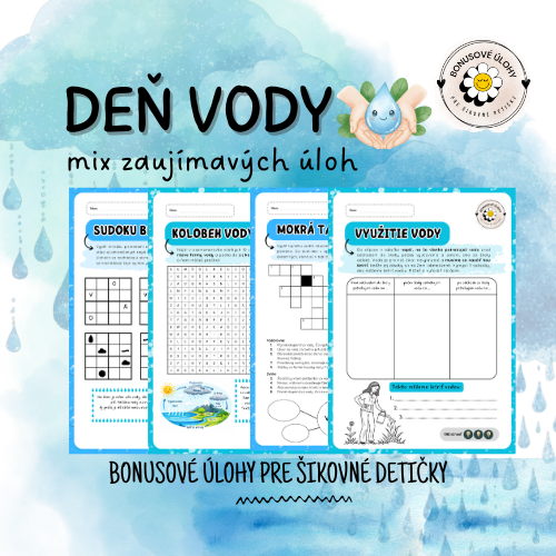 Súbor obsahuje 4 rôzne pracovné listy na Deň vody 💧🚰 🌊, ktoré sú vhodné napríklad ako bonusové úlohy pre šikovné detičky, ktoré už skončili so zadanou prácou. Detičky sa na každej strane dozvedia nejakú zaujímavú informáciu o vode a zároveň podnetnými úlohami porozmýšľajú o jej význame a využití v každodennom živote.