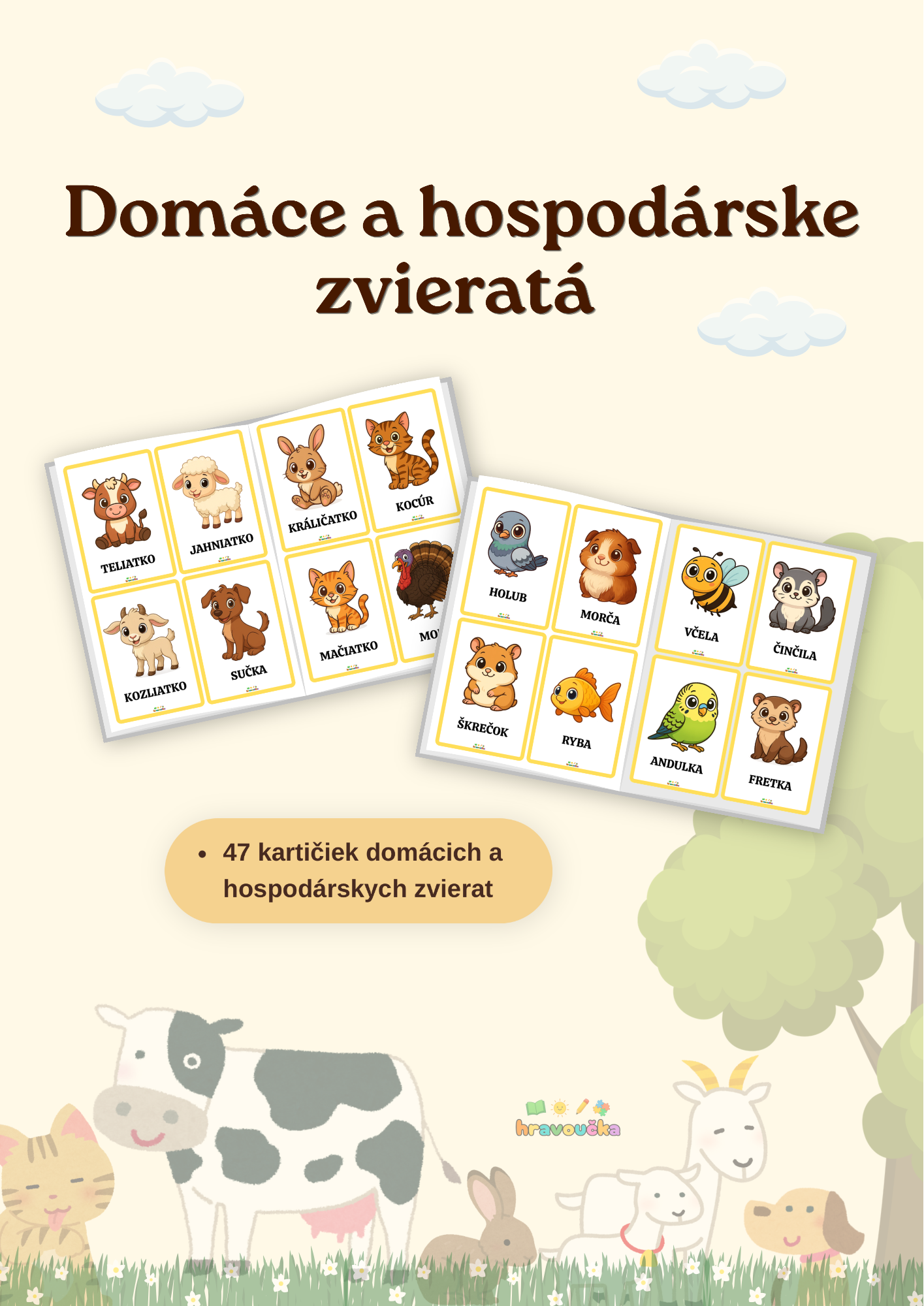 Súbor obsahuje 47 farebných kartičiek s obrázkami domácich a hospodárskych zvierat. Každá kartička je doplnená názvom zvieraťa v slovenskom jazyku. Materiál je vhodný na rozvoj slovnej zásoby u detí predškolského a mladšieho školského veku. Kartičky možno využiť na rôzne didaktické hry, párovanie, triedenie alebo ako názorná pomôcka pri vyučovaní. Po vytlačení a zalaminovaní vydržia dlho.