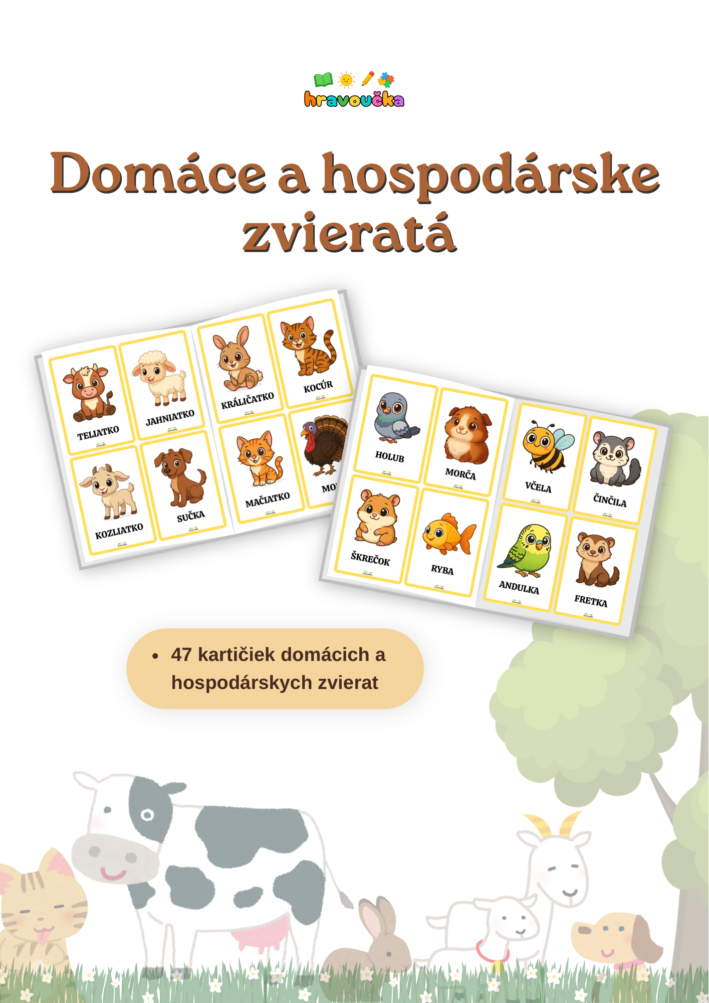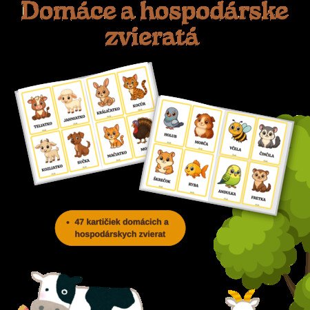 Súbor obsahuje 47 farebných kartičiek s obrázkami domácich a hospodárskych zvierat. Každá kartička je doplnená názvom zvieraťa v slovenskom jazyku. Materiál je vhodný na rozvoj slovnej zásoby u detí predškolského a mladšieho školského veku. Kartičky možno využiť na rôzne didaktické hry, párovanie, triedenie alebo ako názorná pomôcka pri vyučovaní. Po vytlačení a zalaminovaní vydržia dlho.