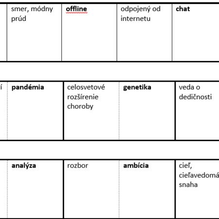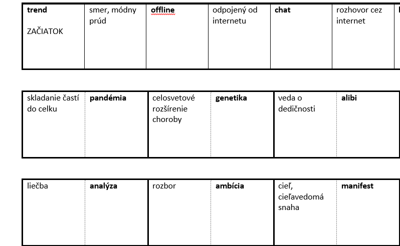 Popis materiálu „Domino – cudzie slová“Základné údajeAutor: Mgr. Paulina MirdalováNázov: Domino – cudzie slováPredmet: Slovenský jazyk a literatúraRočník: 8. – 9. ročník ZŠ (možno použiť aj v nižších ročníkoch 2. stupňa)Typ materiálu: didaktická hra – kartičky na vystrihnutieCieľ a prínosrozšírenie slovnej zásoby o frekventované cudzie slová,prepojenie cudzích slov s ich jednoduchými slovenskými ekvivalentmi,precvičovanie formou hry → rozvoj komunikácie, spolupráce, pozornosti, súťaživosti,možnosť pracovať samostatne, v dvojiciach alebo v skupinách.ObsahDomino obsahuje desiatky kartičiek.Každá kartička má na jednej strane cudzie slovo a na druhej strane slovenský ekvivalent alebo vysvetlenie.Začína sa kartou ZAČIATOK a končí sa kartou KONIEC.Obsahuje napríklad slová: ambícia, symbióza, byrokracia, cynik, hystéria, hypochonder, pyramída, obelisk, laser, epicentrum, myrha, homonymum, globálny, lokálny a ďalšie.Praktické využitieMateriál je možné vytlačiť, zalaminovať a rozstrihať → vznikne tak trvácna a opakovane použiteľná pomôcka.Hra sa hrá ako klasické domino: žiaci postupne prikladajú kartičky tak, aby slovo nadväzovalo na svoj ekvivalent.Môže slúžiť:na úvod hodiny ako „rozohriatie“,ako hlavná aktivita (súťaž v skupinách),ako opakovanie učiva na konci tematického celku.Didaktické prínosyAplikačné učenie – žiaci spájajú poznatky s praktickou činnosťou.Aktivizujúce učenie – hra motivuje k zapájaniu sa a súťaživosti.Reflexívne učenie – žiaci si uvedomujú, ktoré slová poznajú a kde majú rezervy.