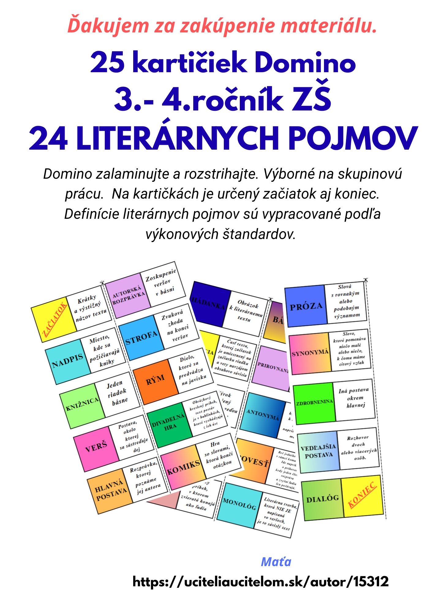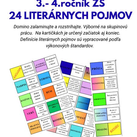 Domino - literárne pojmy 3.-4.ročník. 24 literárnych pojmov. Domino zalaminujte a rozstrihajte. Výborné na skupinovú prácu. Na kartičkách je určený začiatok aj koniec. Definície literárnych pojmov sú vypracované podľa výkonových štandardov.