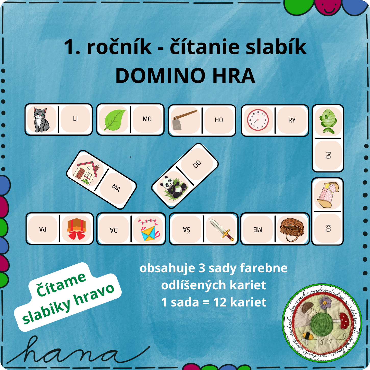 - 3 sady kariet - každá sada obsahuje 12 kariet s obrázkami a slabikami.