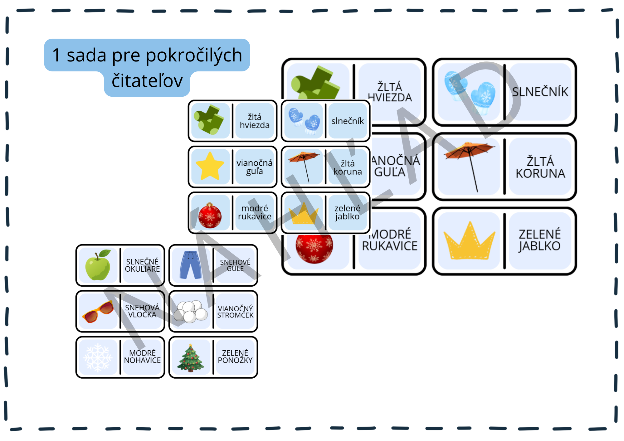 3 sady kariet - každá sada obsahuje 12 kariet s obrázkami a slabikami. (každá vo verzii malých a