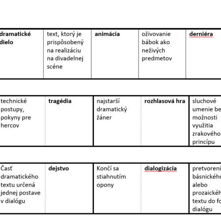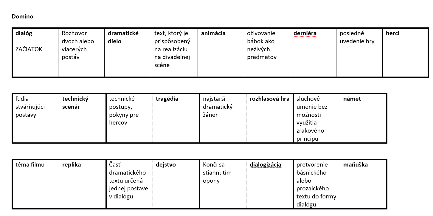 Materiál je vhodné doplniť krátkou reflexiou/sebahodnotením – žiak si uvedomuje, ktoré pojmy ovláda a ktoré potrebuje precvičiť, čím sa podporuje metakognícia.domino - dráma