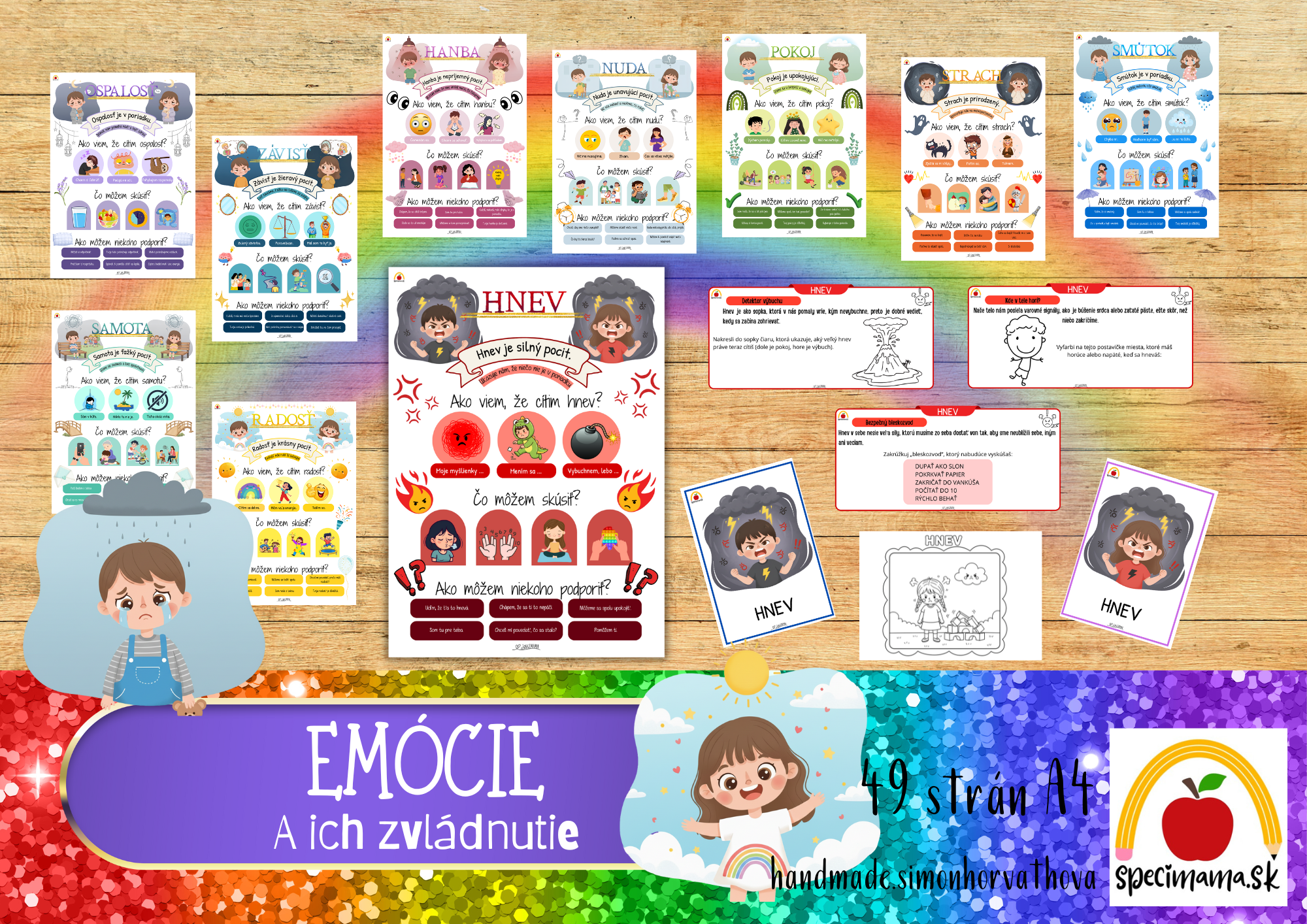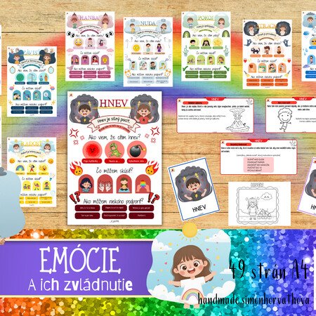 Obsahuje prehľadné plagáty k jednotlivým emóciám, otázky na rozhovor, konkrétne stratégie zvládania a doplnkové karty. Je vhodný na individuálnu prácu, skupinové aktivity aj ranné kruhy, kde slúži ako výborný podklad na rozhovory o pocitoch a prežívaní detí.