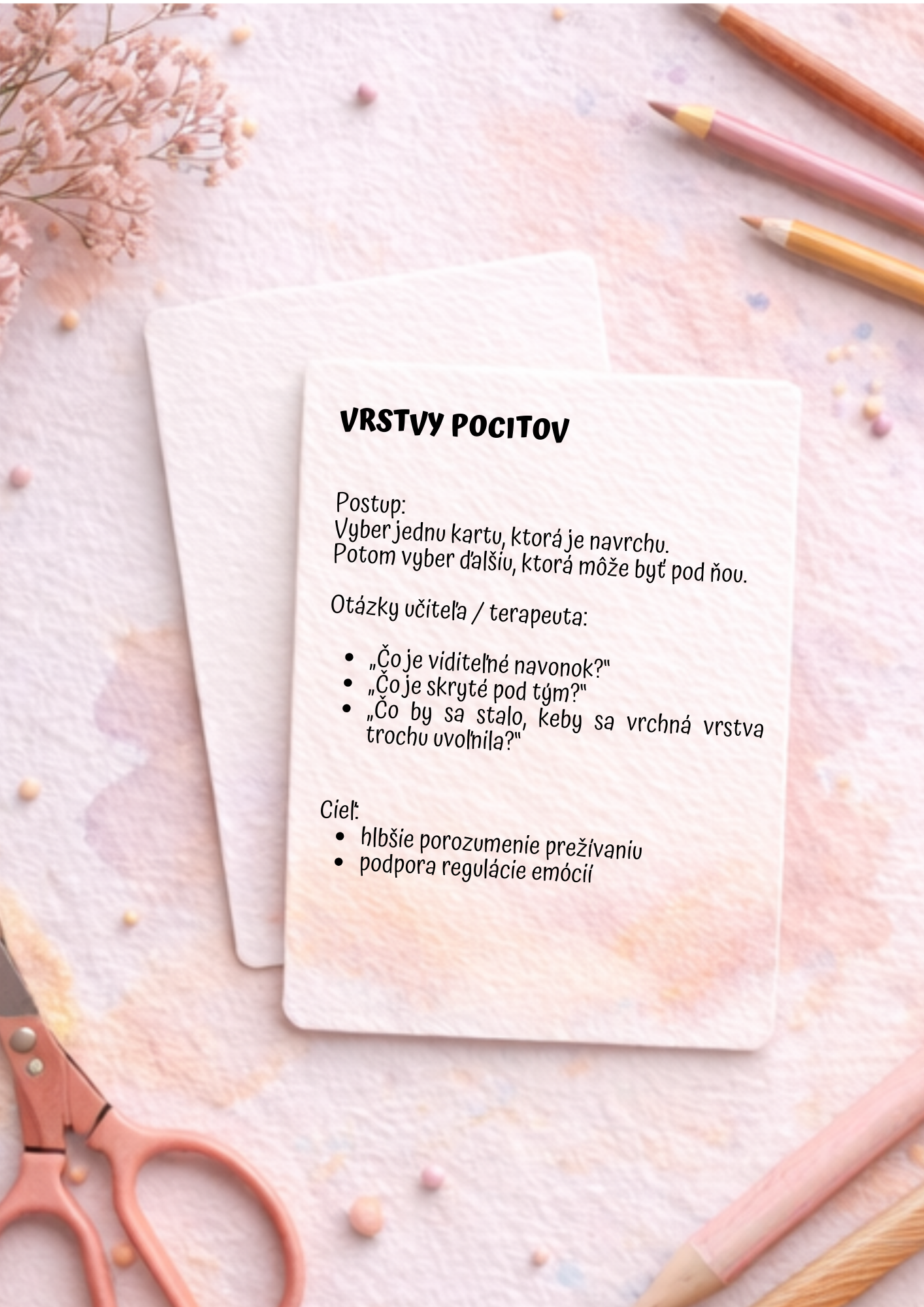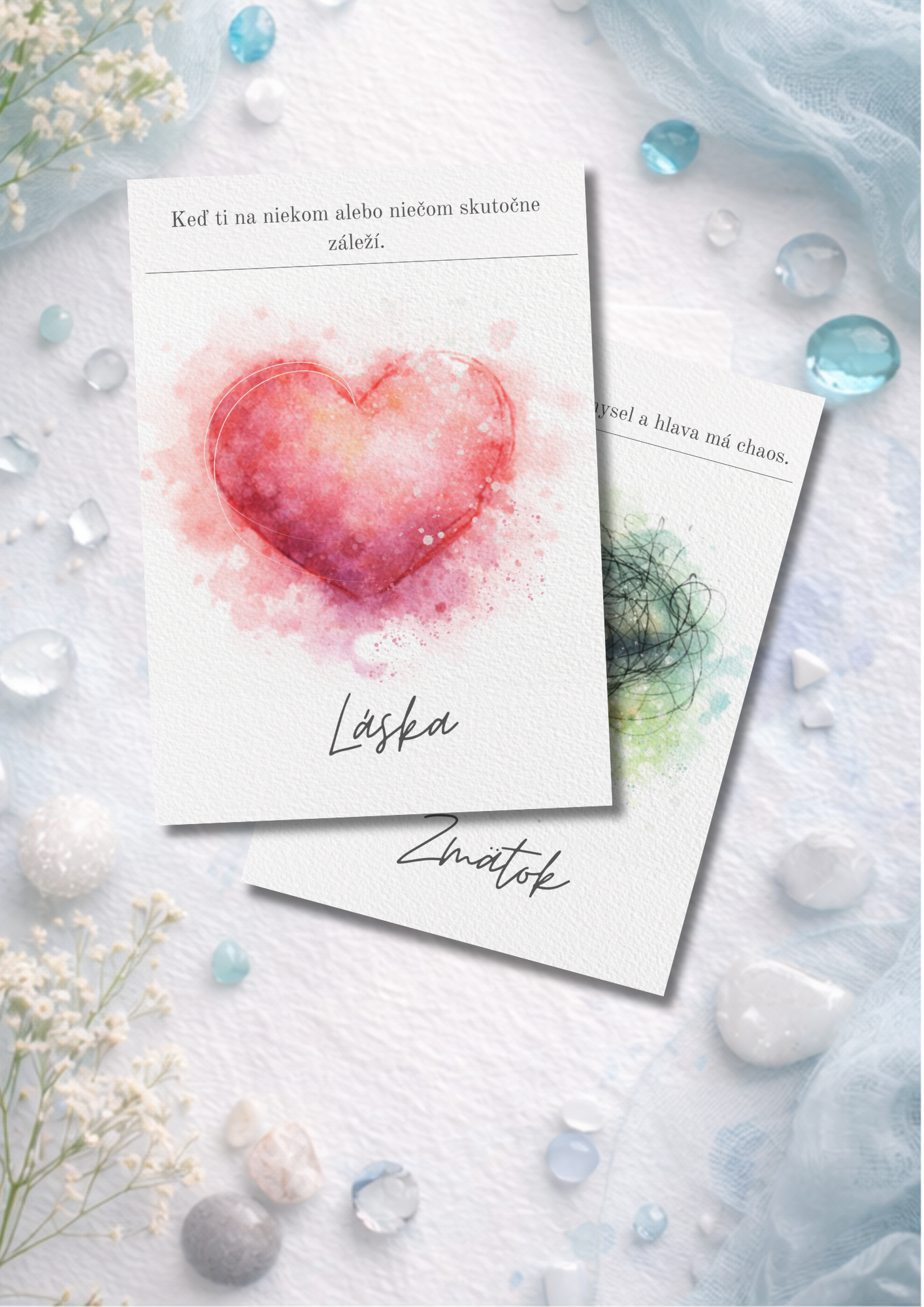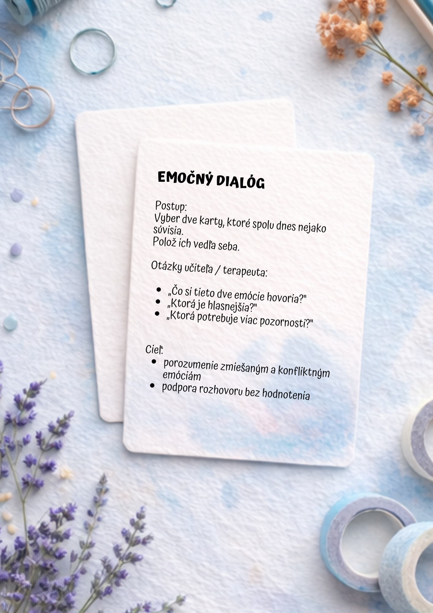 Emočné karty sú jemným, ale účinným nástrojom na podporu sebapoznania, regulácie emócií a bezpečného rozhovoru – bez tlaku na slová. Abstraktné vizuály umožňujú pracovať s prežívaním prirodzene, tvorivo a citlivo.