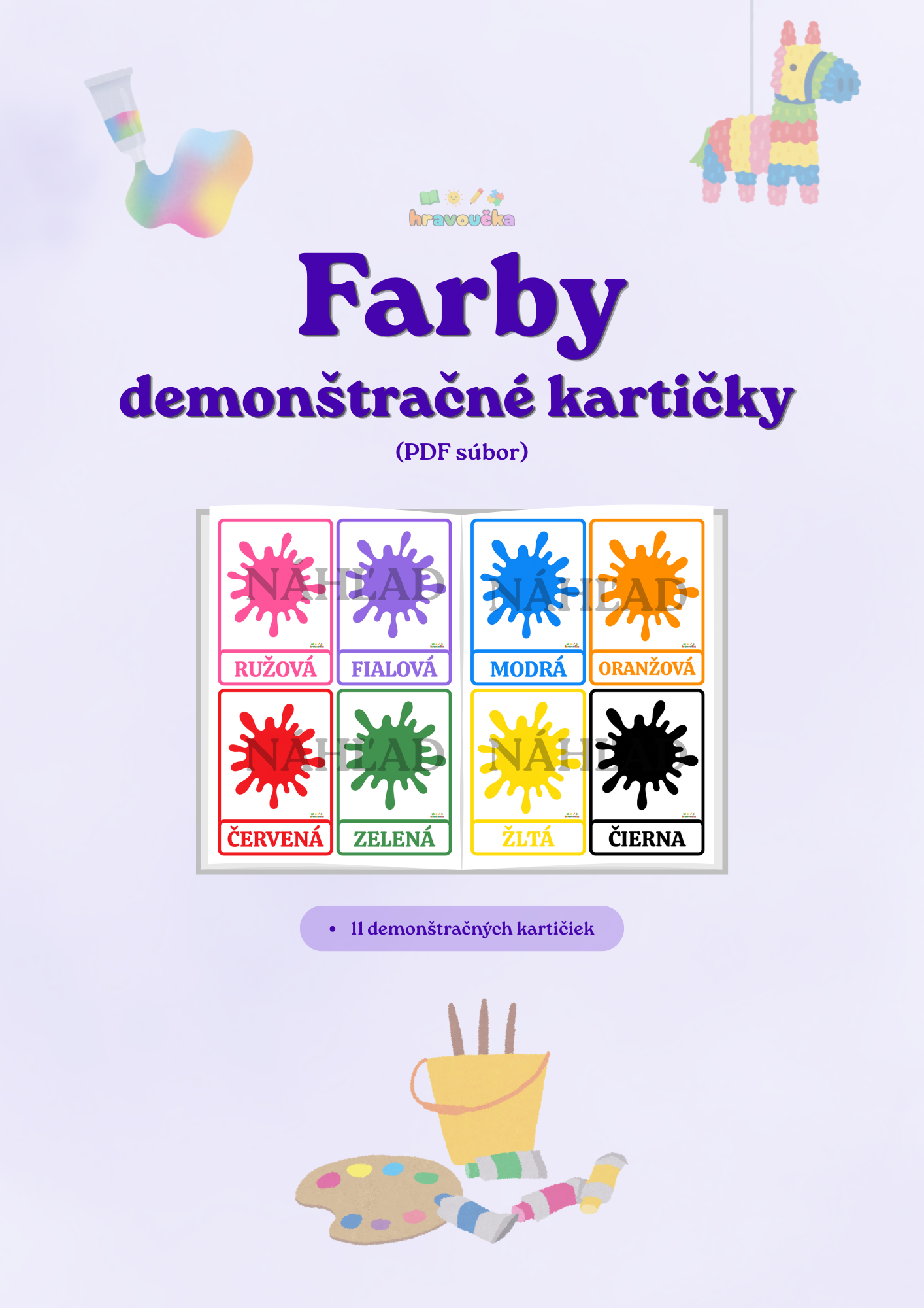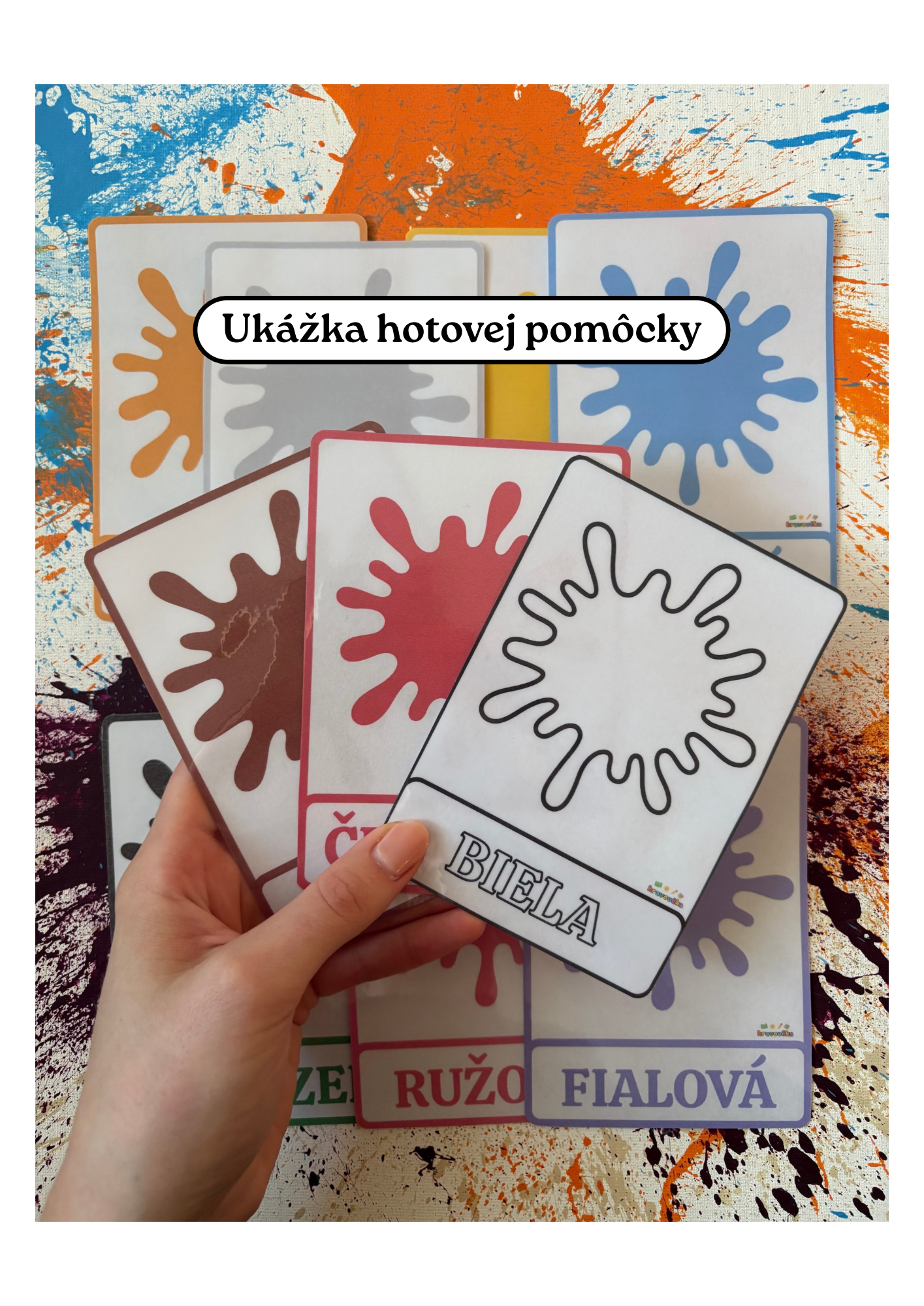 Súbor obsahuje 11 kariet zameraných na poznávanie základných farieb. Každá karta obsahuje farebnú škvrnu a slovenský názov farby.