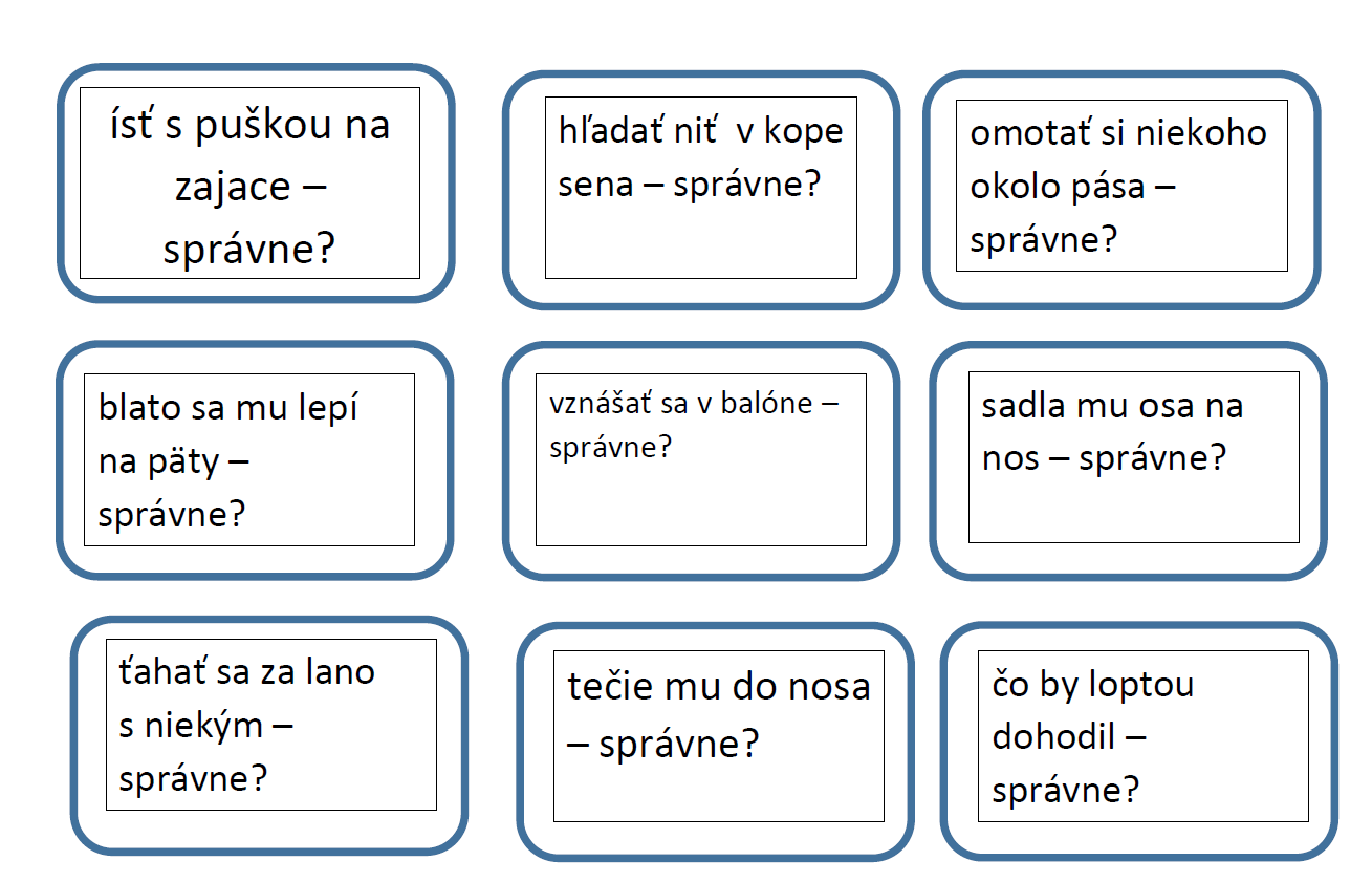 List obsahuje súbor výrazov (frazém), pri ktorých majú žiaci rozhodnúť, či sú použité správne alebo nesprávne. Ide o typické ustálené slovné spojenia, ktoré sa často v bežnej reči používajú v prenesenom význame (napr. ísť s puškou na zajace, hľadať niť v kope sena, sadla mu osa na nos atď.).Didaktický cieľ:
