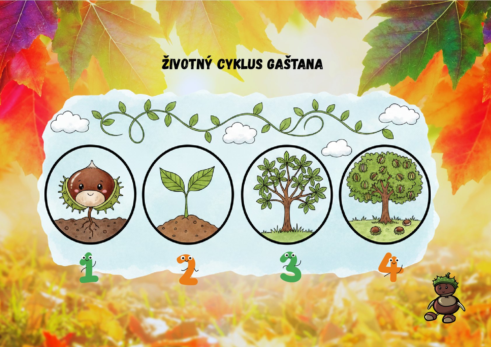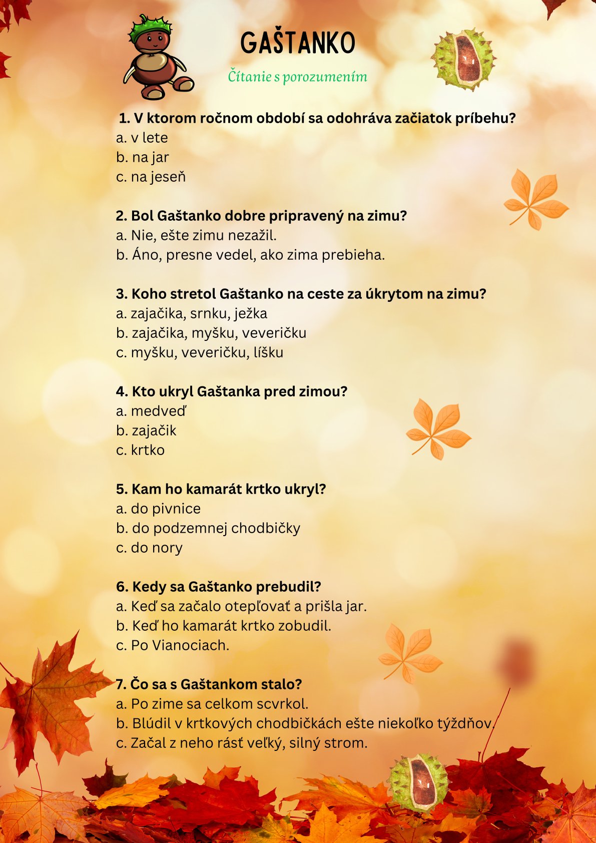 s jeseňou prichádza aj čas gaštanov. K aktuálnej tematike preto bezpochyby patrí aj príbeh o Gaštankovi, ktorý hľadá pre seba úkryt pred zimou. Potom, ako ho zvieratká žijúce v lese odmietnu, mu pomôže jeho kamarát krtko. To najväčšie prekvapenie ho však čaká s príchodom jari. Zvieratká žasnú, keď z malého Gaštanka vyrastie nádherný strom. Deti sa pomocou príbehu zoznámia s prírodnými cyklami, upevnia slovnú zásobu, rozšíria sociálne kompetencie, posilnia predstavivosť, súčastne získajú základné prírodovedné poznatky.