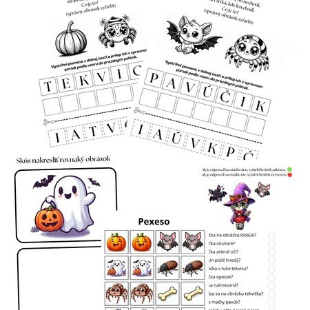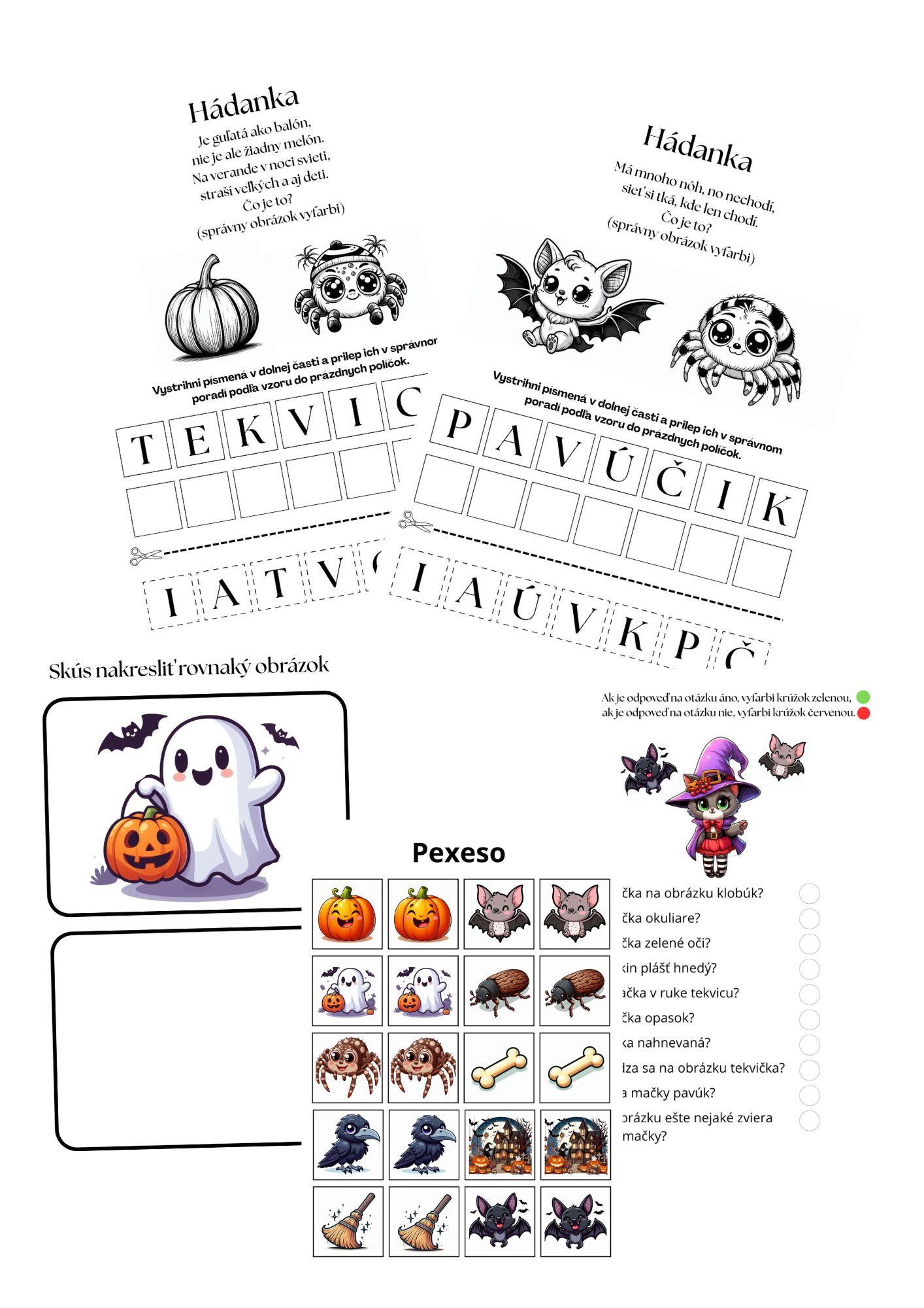 Prvé dve stránky sú pracovné listy. Žiaci najskôr uhádnu hádanku, vyfarbia správny obrázok, potom vystrihujú písmená a prilepia ich na správne miesto podľa vzoru.