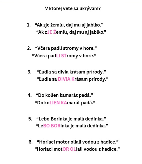 - Sluchová pozornosť a diskriminácia: Aby dieťa vôbec našlo skryté slovo, musí sa sústrediť a odfiltrovať všetky ostatné zvuky vo vete. Učí sa počúvať nielen slová, ale aj jednotlivé zvuky, z ktorých sa skladajú.