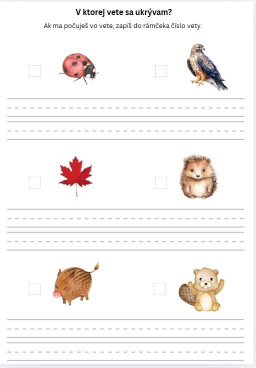 - Obmena cvičenia - obrázky môžu vyfarbiť, vyslabikovať, určiť prvú či poslednú hlásku, zapísať.
