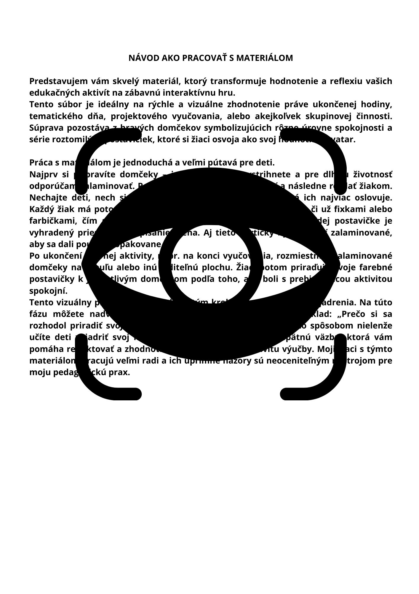 Súbor Hodnotiace domčeky s postavičkami sú ideálne na rýchle zhodnotenie akéhokoľvek vyučovacieho dňa (blokového, projektového, tematického), alebo hodiny. Deti si vyberú a vyfarbia svoju vlastnú postavičku, ktorá sa stane ich osobným hodnotiacim avatarom. Potom ju priradia k Domčeku, ktorý najlepšie vystihuje ich pocit zo spoločnej aktivity.