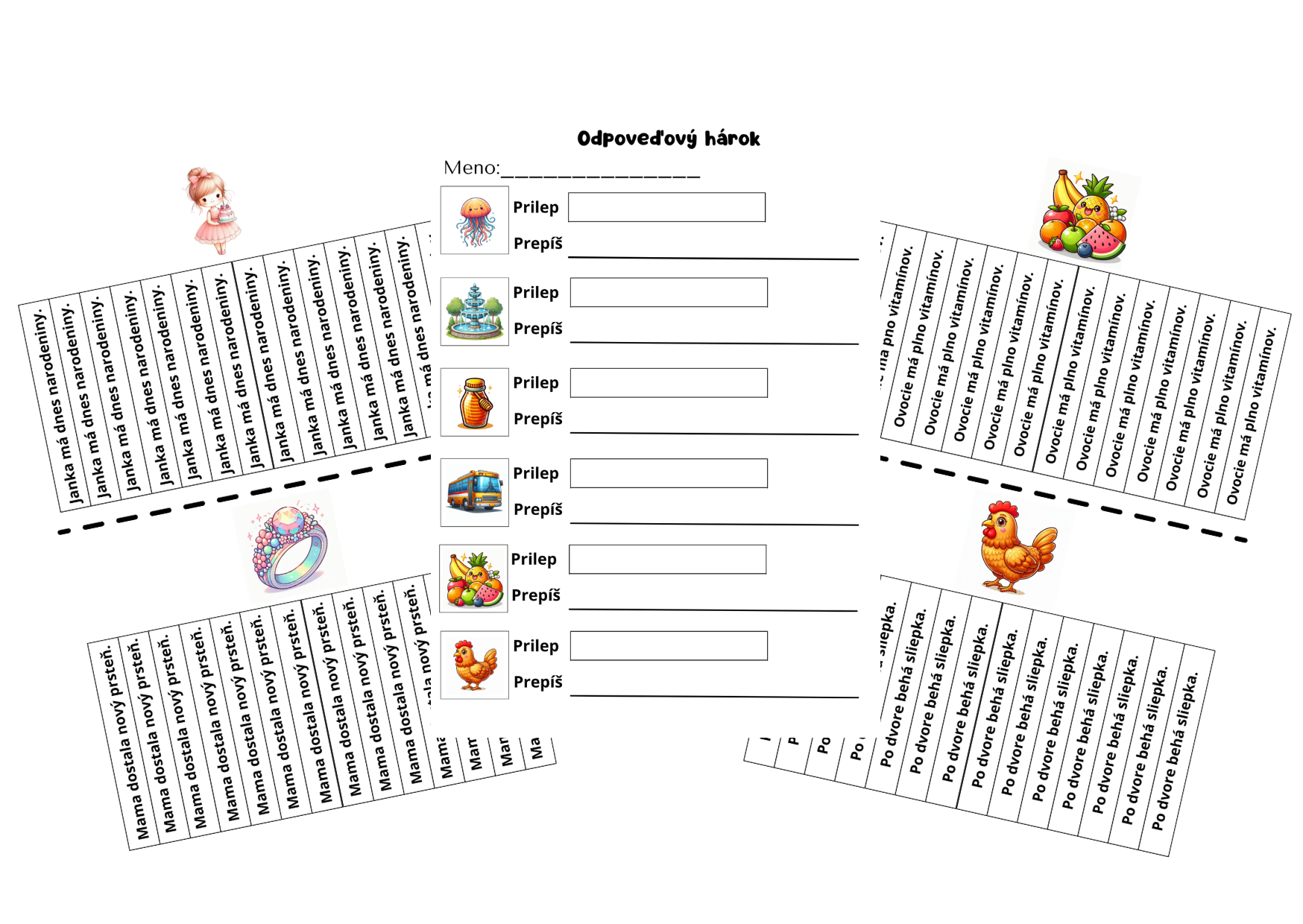 Žiakom rozstriháte jednotlivé obrázky s vetami a rozmiestnite po triede. Úlohou žiaka je odtrhnúť si jednu vetu, prilepiť si ju na odpoveďový hárok k príslušnému obrázku. Vetu následne prepíšu písaným písmom.