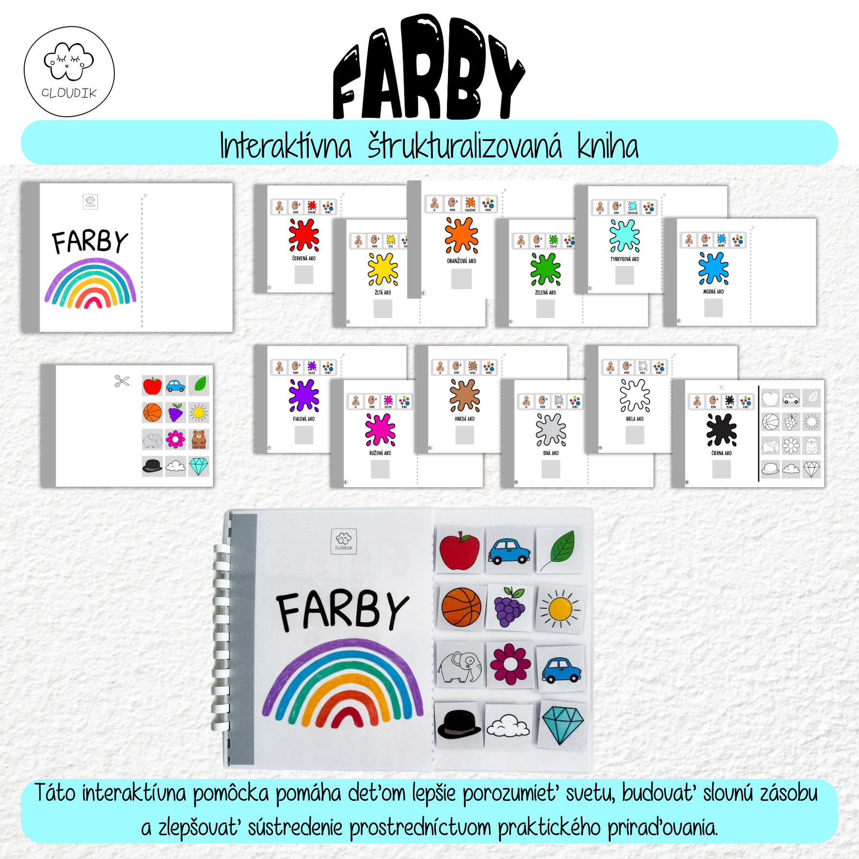 Pomôžte deťom objavovať svet farieb hravou a zrozumiteľnou formou. Naša Interaktívna štruktúrovaná kniha: FARBY je navrhnutá tak, aby podporovala rozvoj reči, kognitívnych schopností a jemnej motoriky prostredníctvom praktického priraďovania.