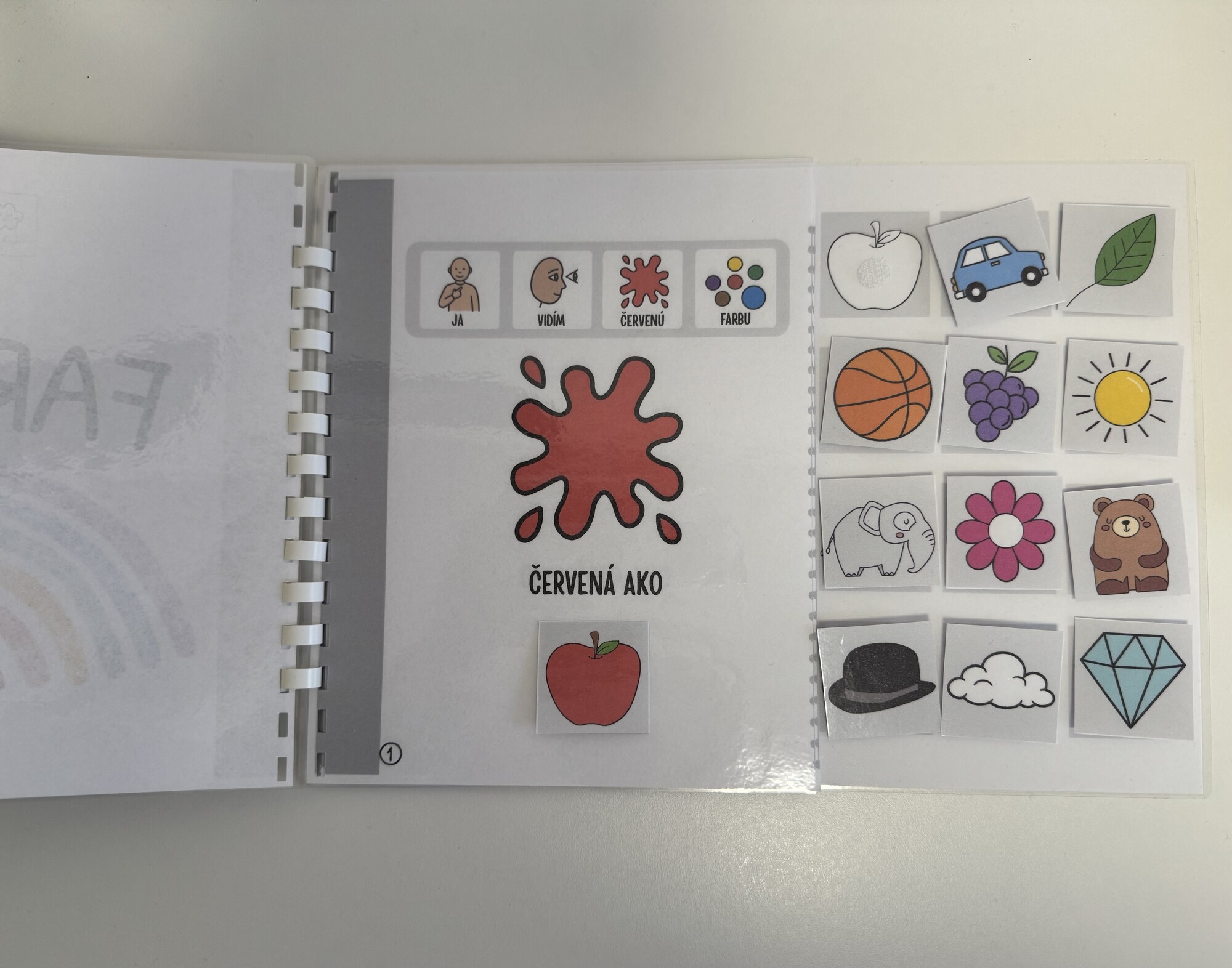 Vizuálna podpora (AAC): Každá strana obsahuje piktogramy s vetnou štruktúrou (napr. "Ja vidím červenú farbu"), čo uľahčuje tvorenie viet a rozširovanie slovnej zásoby.