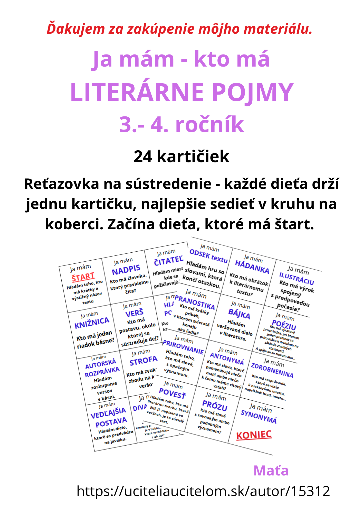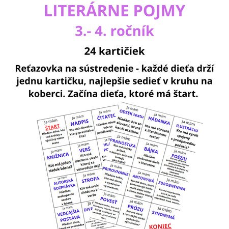 Hra Ja mám-kto má. Literárne pojmy 3.-4.ročník. 24 kartičiek. Reťazovka na sústredenie - každé dieťa drží jednu kartičku, najlepšie sedieť v kruhu na koberci. Začína dieťa, ktoré má štart.