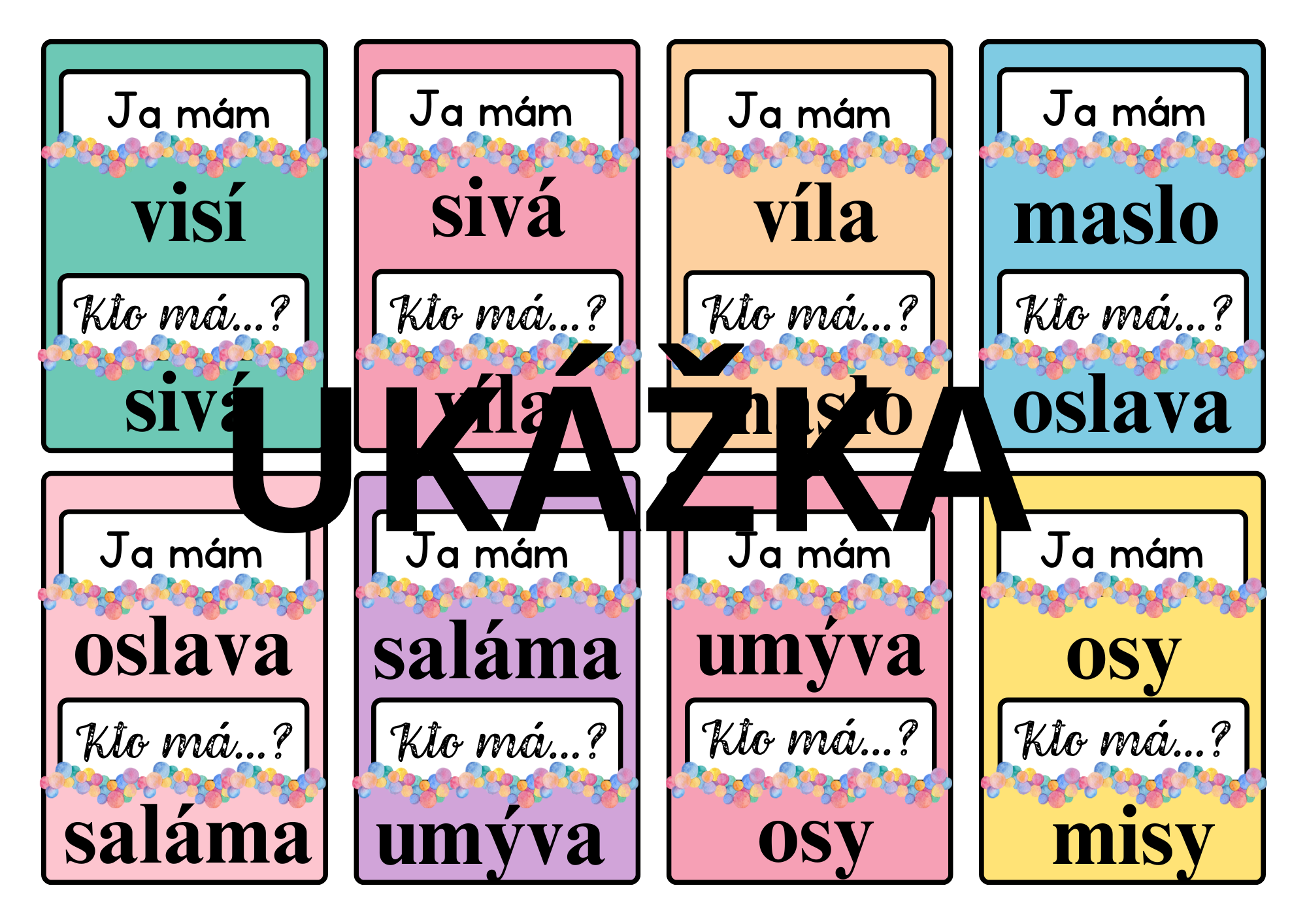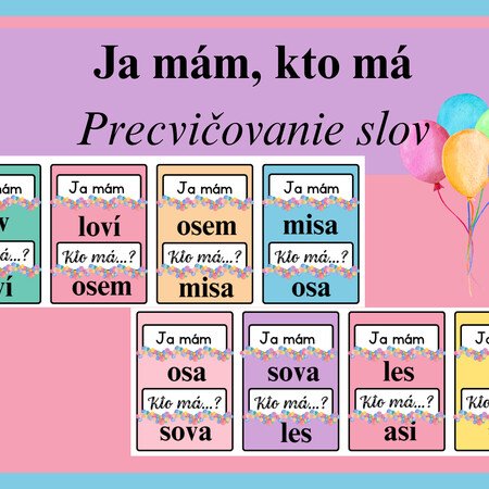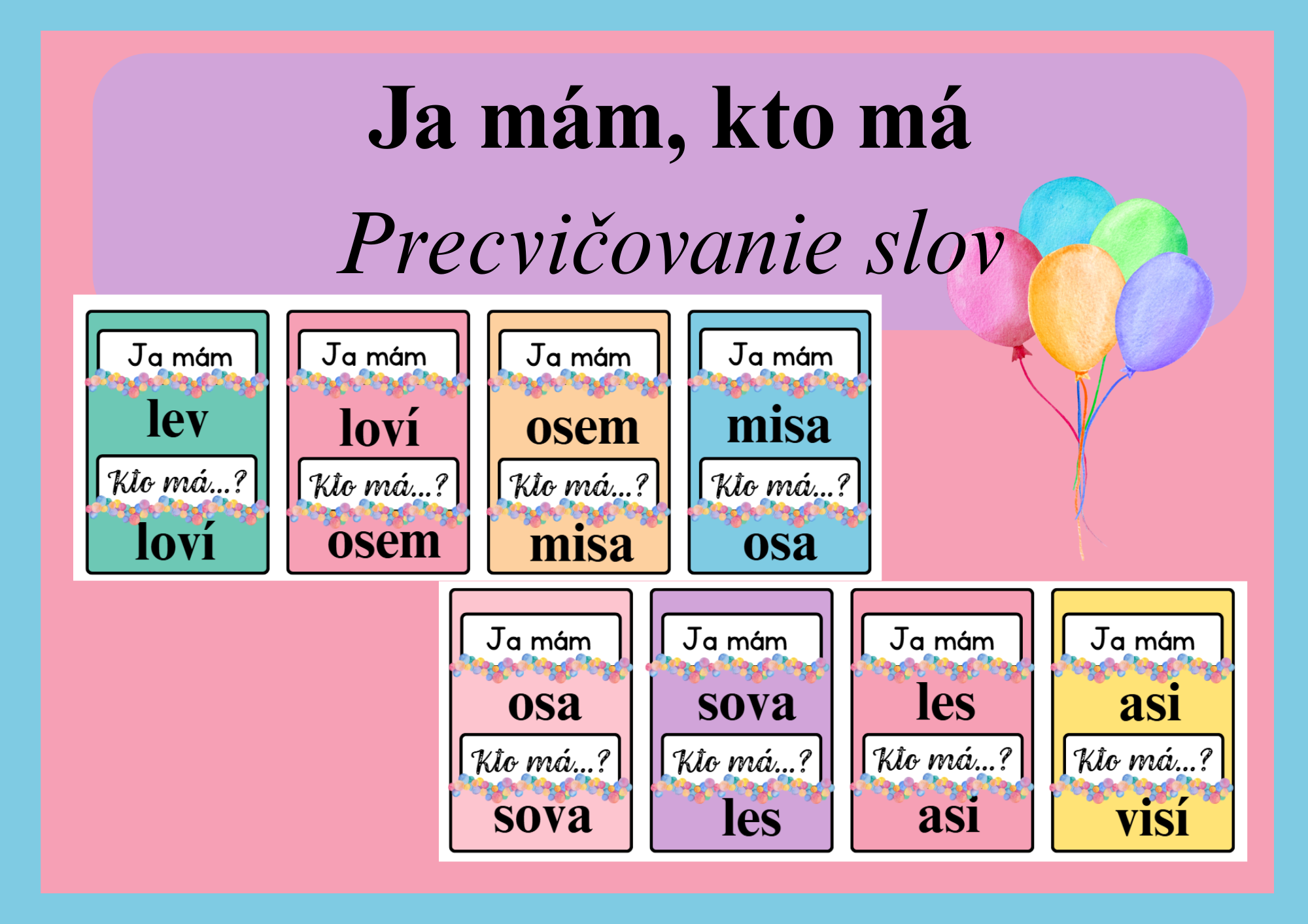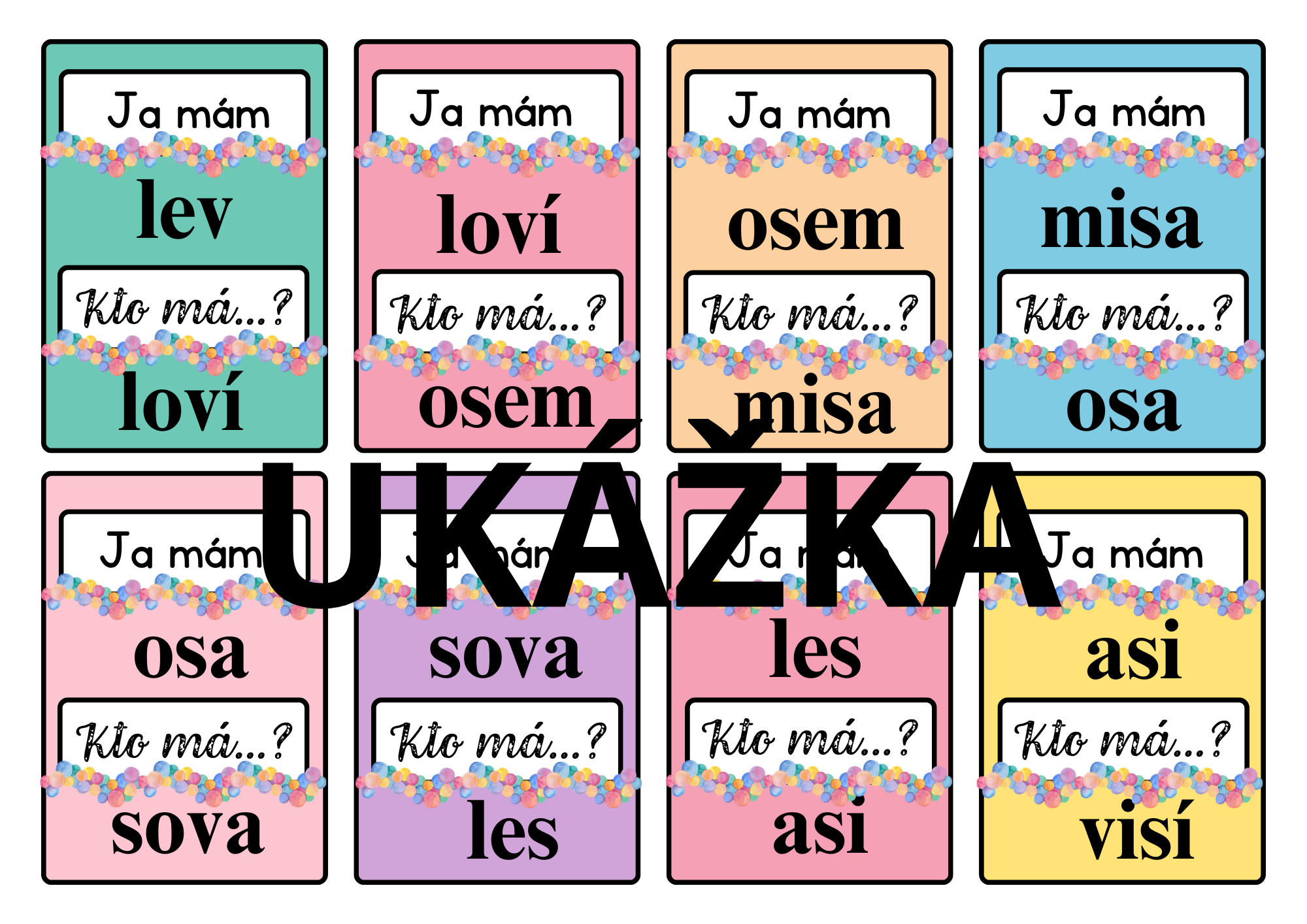 Súbor obsahuje 24 kartičiek s prvými slovami napr. lev, loví, umýva, oslava...