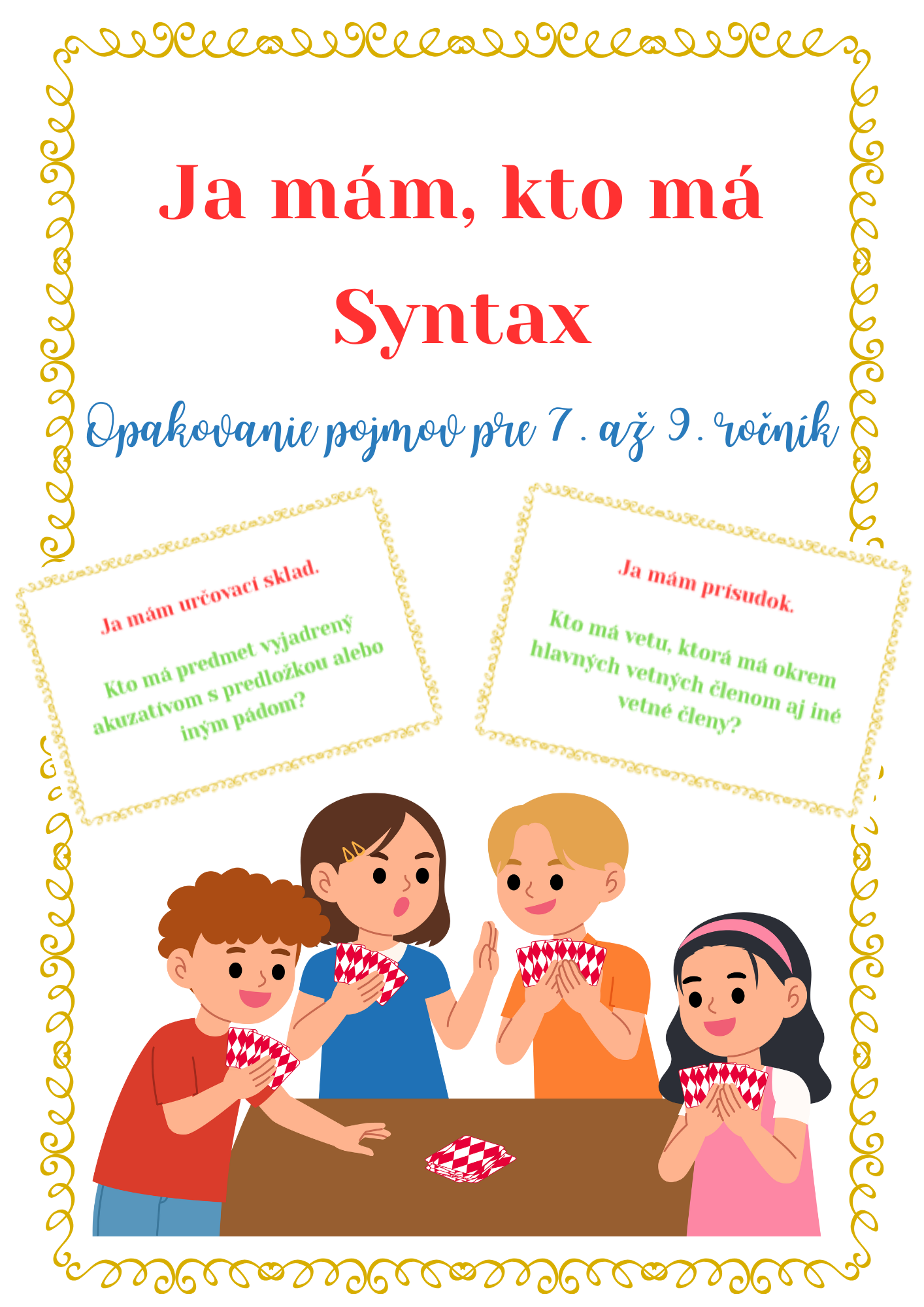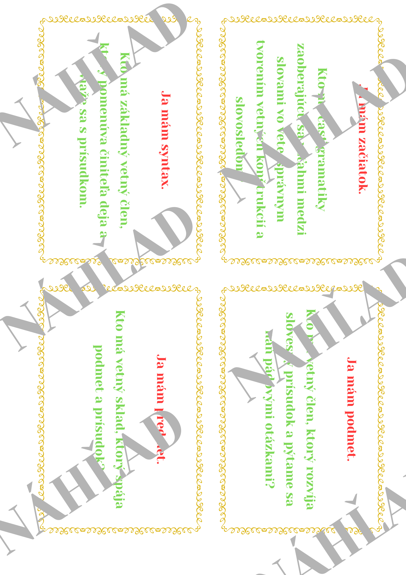 Súbor obsahuje 24 kartičiek na hru Ja mám, kto má. Z mojej skúsenosti je to ideálny počet, aby hra netrvala príliš dlho a žiaci sa príliš nezamotali. Kartičky sú zamerané na pojmy z vetných členov a vety. Všetky tieto pojmy by mali ovládať žiaci na konci 7. ročníka. Môžete ich teda využiť pre 7. až 9. ročník ako opakovanie. Na poslednej strane ponúkam správne vytvorený rad. Kartičky môžete tlačiť farebne aj čiernobielo. Odporúčam zalaminovať.
