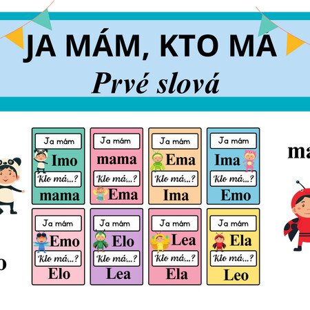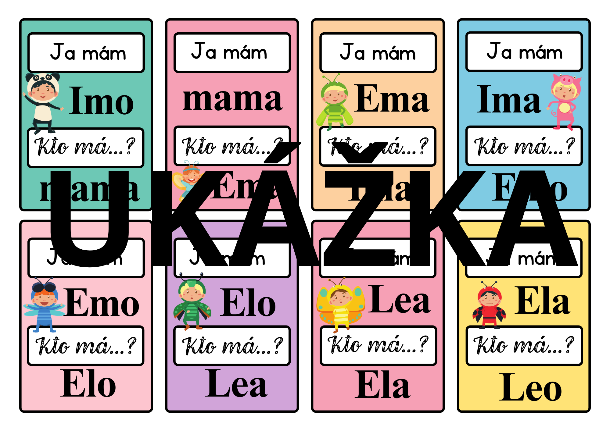 Zoznam slov: Imo,mama, Ema, Ima, Emo, Elo, Lea, Ela, Leo, Ala, Lola, Lili, Ali, Ivo, Vilo, Eva, Sisa, Samo, Oli, Silva, Iva, Sisi, Silvo, Lila