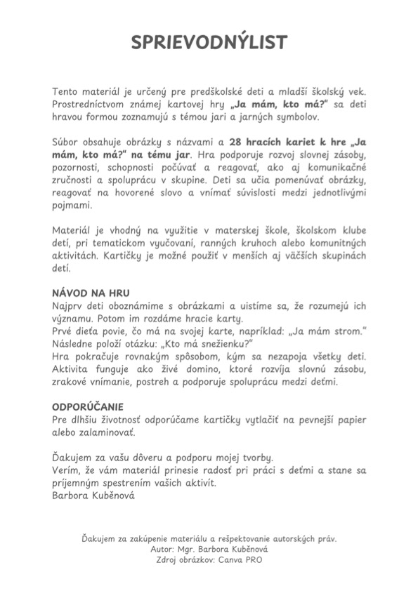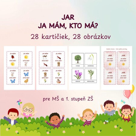 Obsahuje 28 hracích kartičiek k hre „Ja mám, kto má?“ na tému jar. Na kartičkách sa nachádza 28 jarných obrázkov s názvami, ktoré pomáhajú deťom rozvíjať slovnú zásobu a spoznávať jarné symboly.