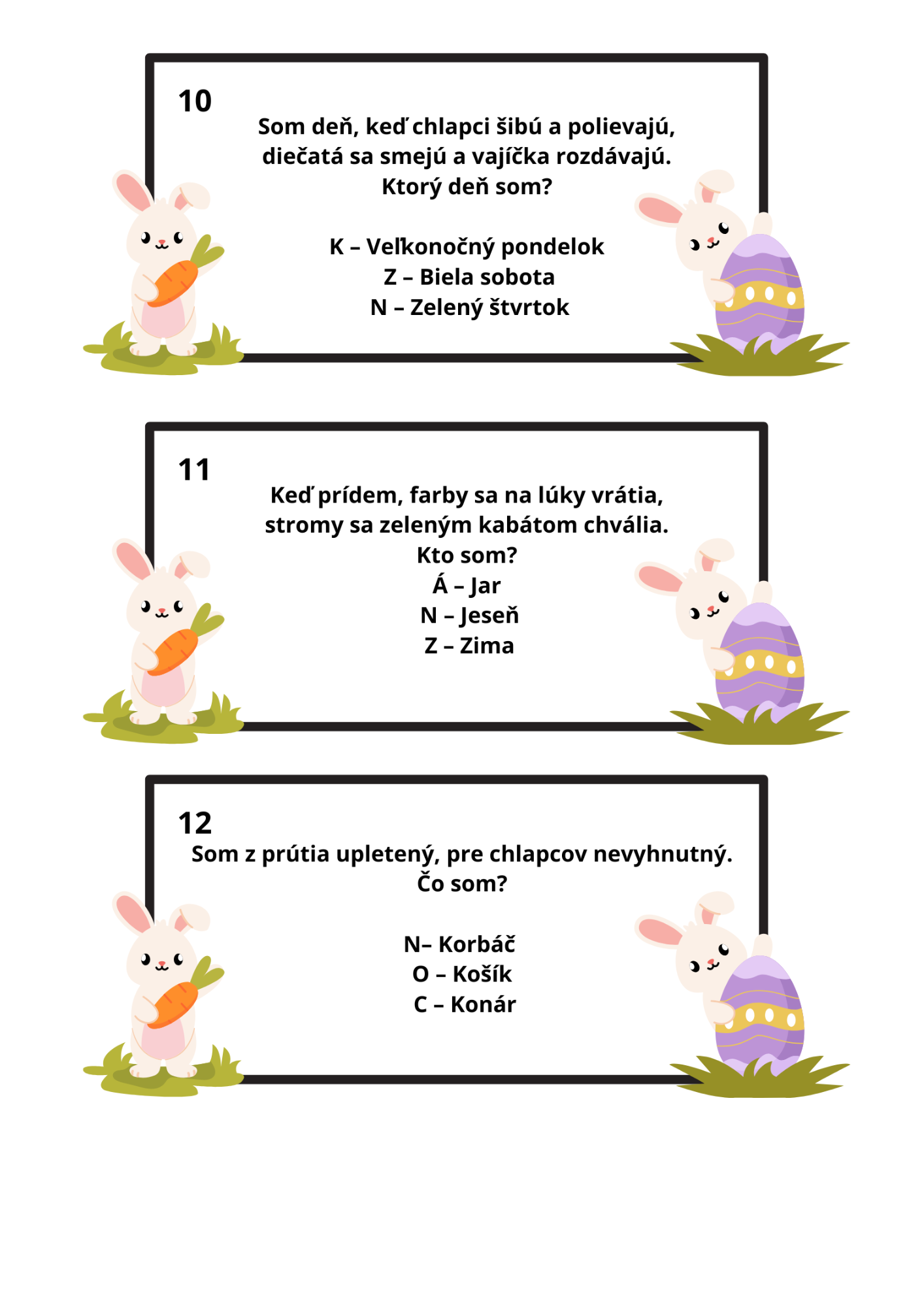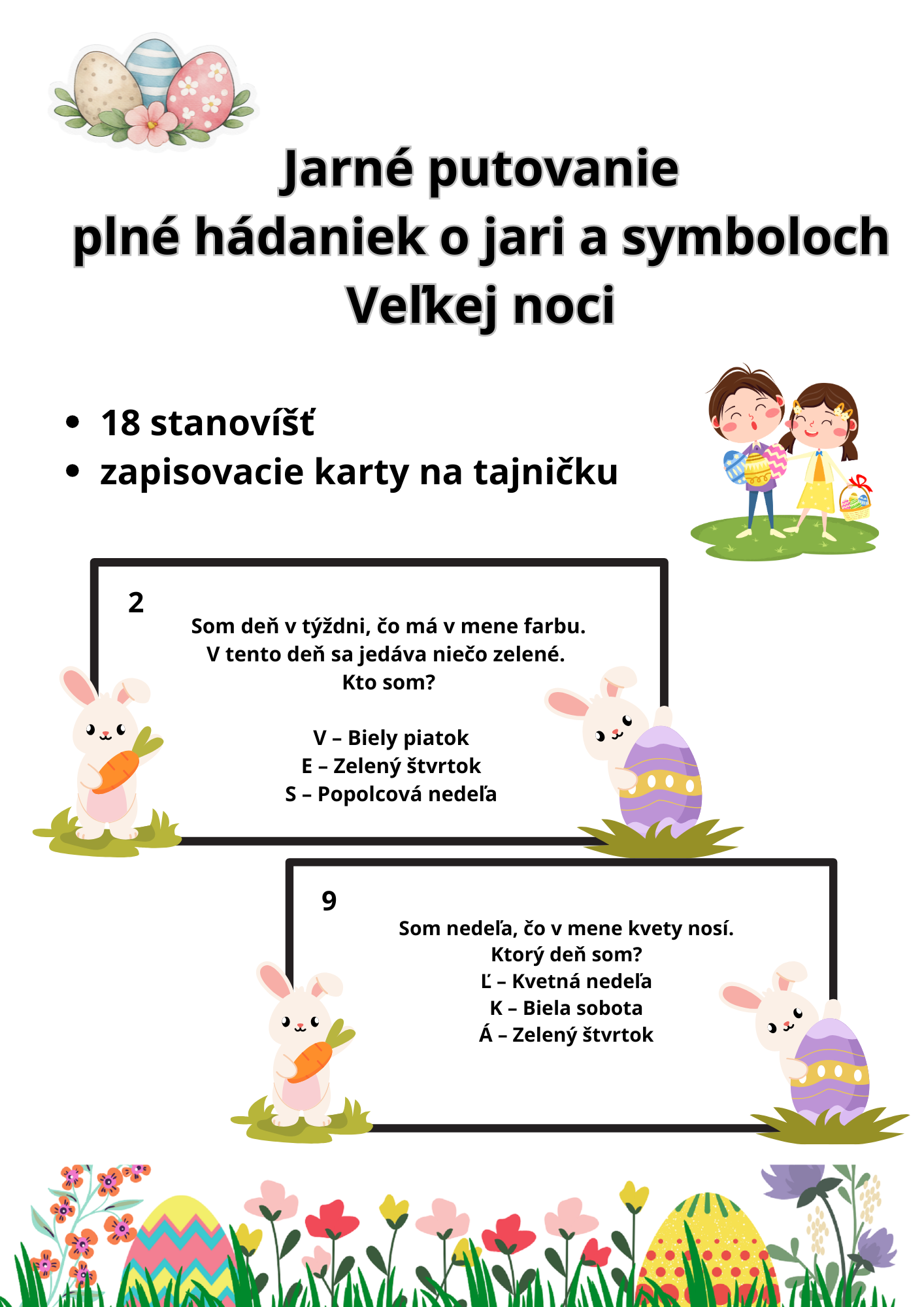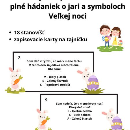 Deti sa vydajú na cestu medzi úlohami, riešia hádanky o jari, zvieratkách a veľkonočných symboloch a postupne zbierajú písmenká do tajničky. Na konci ich čaká sviatočný odkaz: