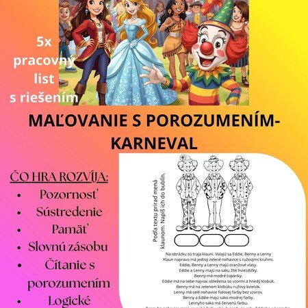 Tieto pracovné listy spájajú čítanie s porozumením, logiku a tvorivý prejav. Deti nevyfarbujú podľa obrázka, ale podľa logických indícií uvedených v texte, čím rozvíjajú schopnosť sústrediť sa a porovnávať informácie.